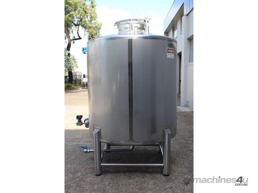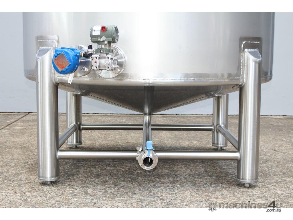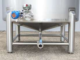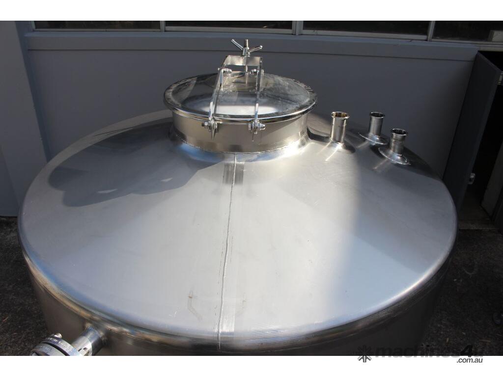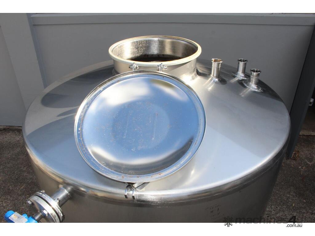 Stainless Steel Tank, 3,000L capacity, internal dimensions of 1500mm diameter - 1500mm deep, fully enclosed design with a 450mm diameter top-entry manway and hinged lid, conical bottom with a 50mm diameter centre outlet turned to the side, mounted on four welded stainless steel tubular legs