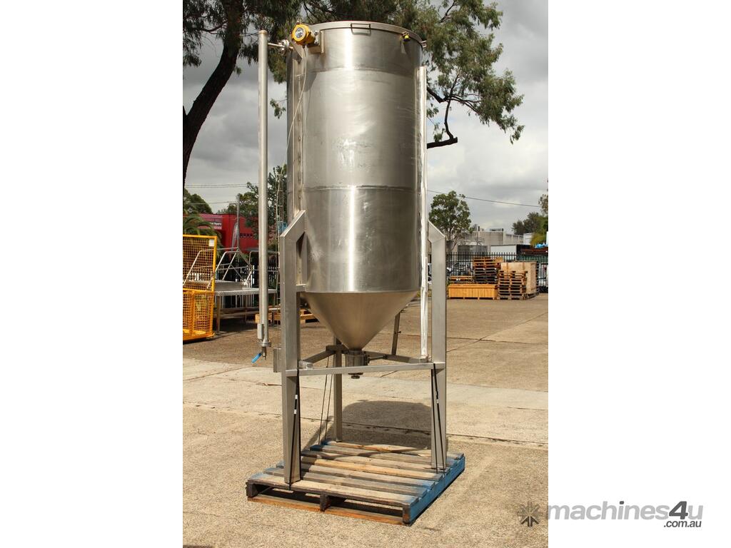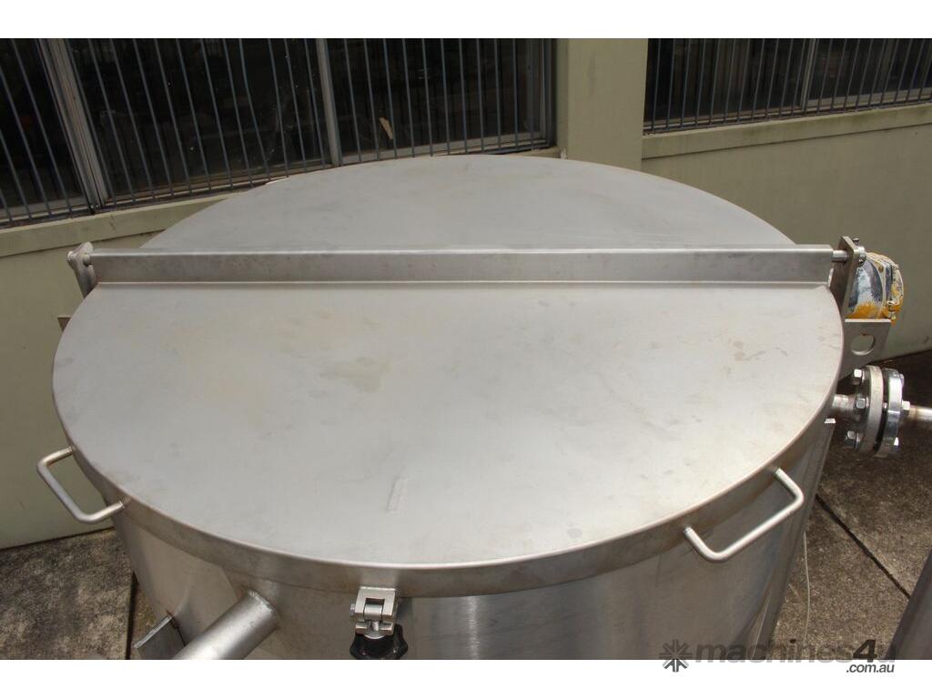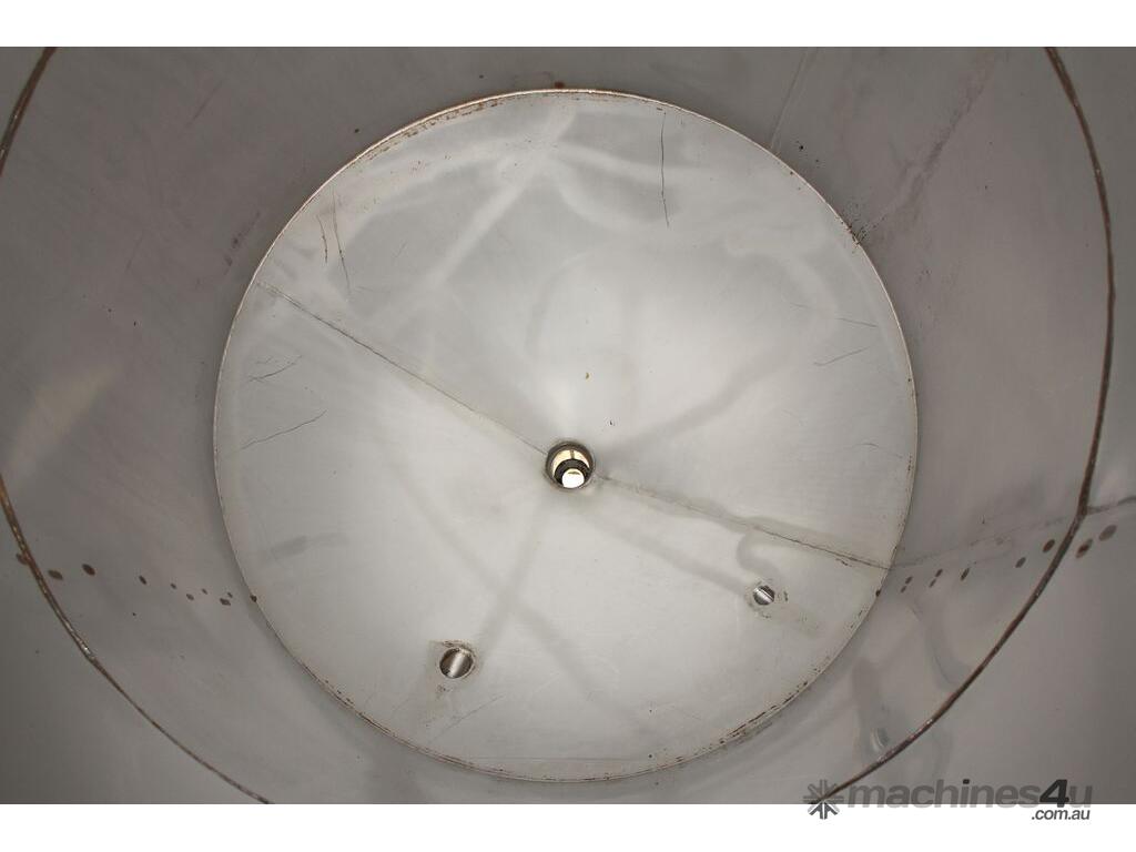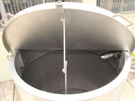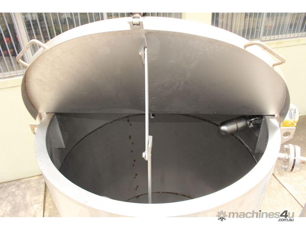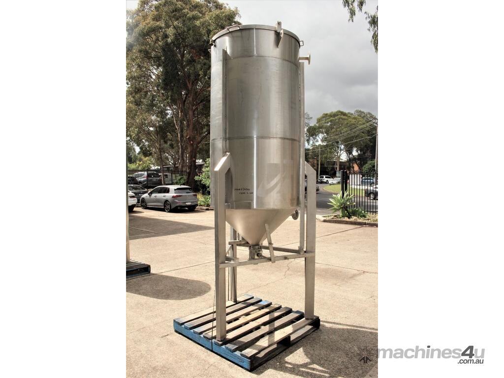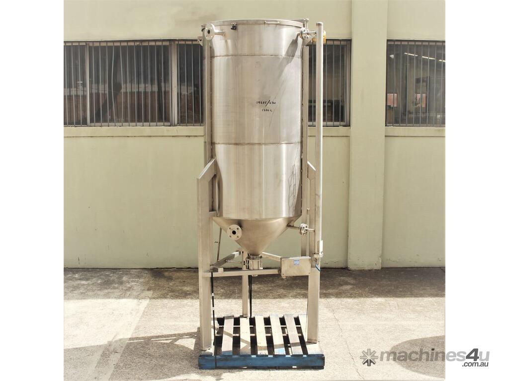 Stainless Steel Tank, capacity 1200L, internal dimensions: 950mm dia x 1720mm deep, open top with half split hinged lids, conical bottom with 35mm dia discharge valve at 600mm high outlet, 3 rectangular welded legs, overall height 3050mm