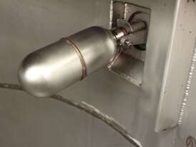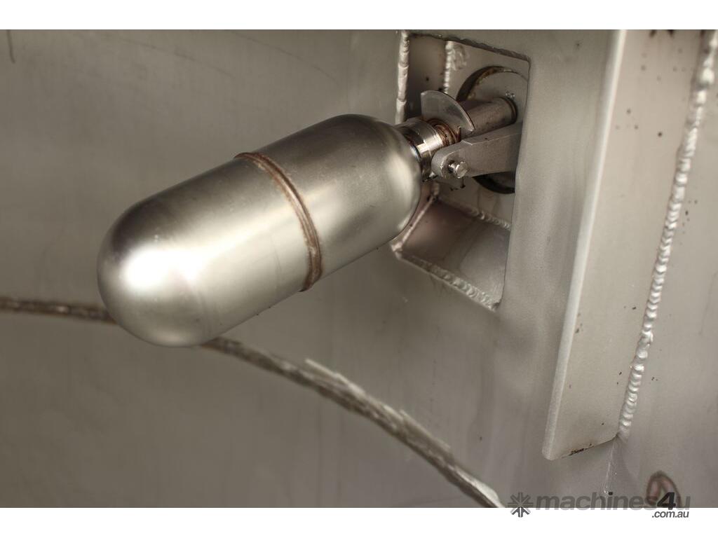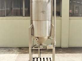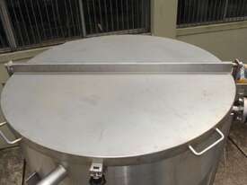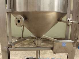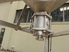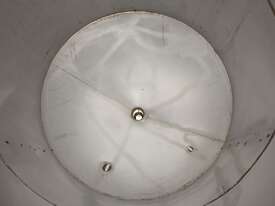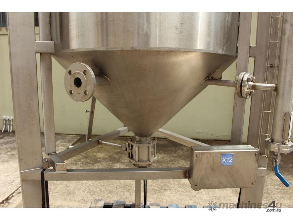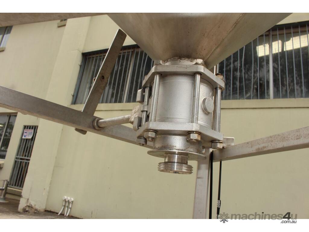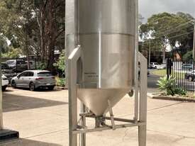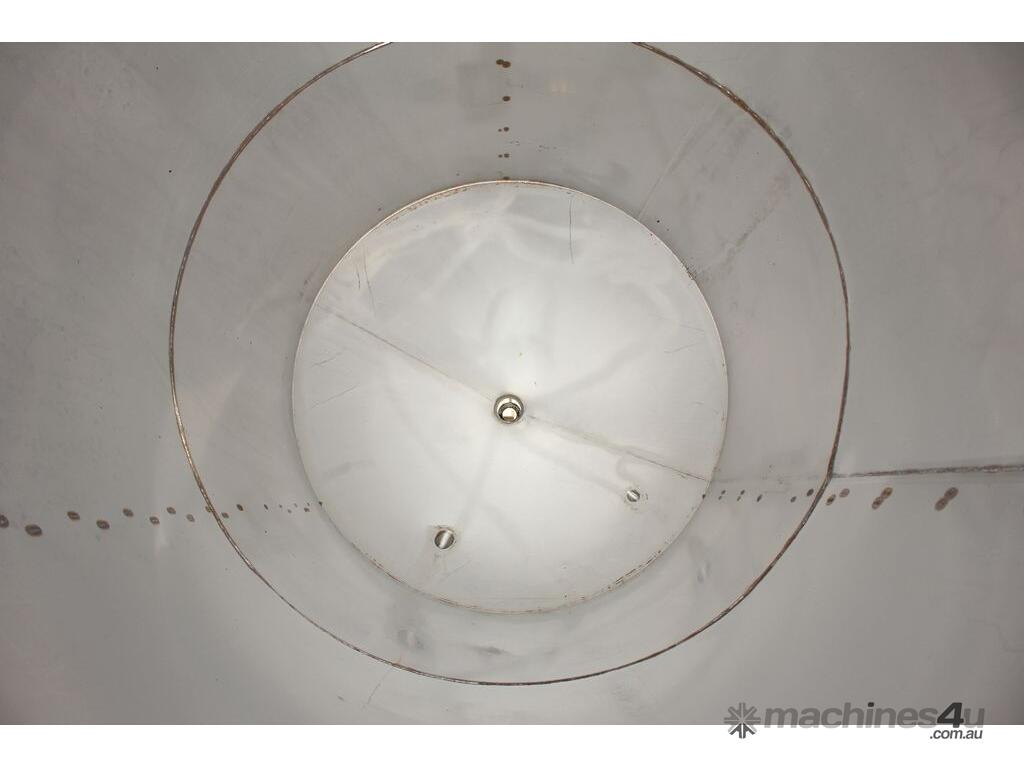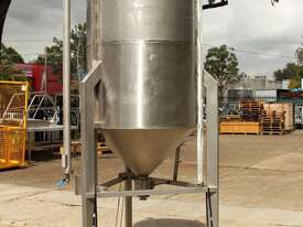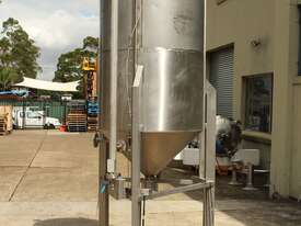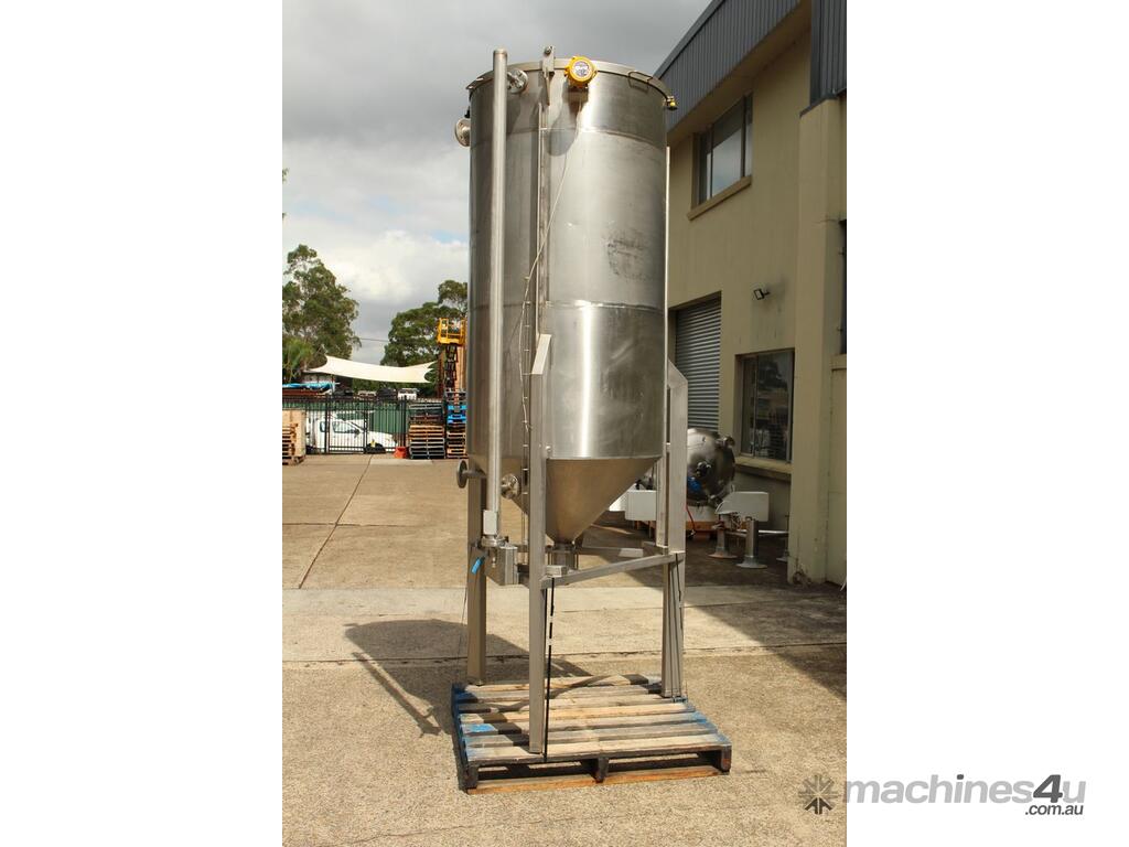 Stainless Steel Tank, capacity 1200L, internal dimensions: 950mm dia x 1720mm deep, open top with half split hinged lids, conical bottom with 35mm dia discharge valve at 600mm high outlet, 3 rectangular welded legs, overall height 3050mm
