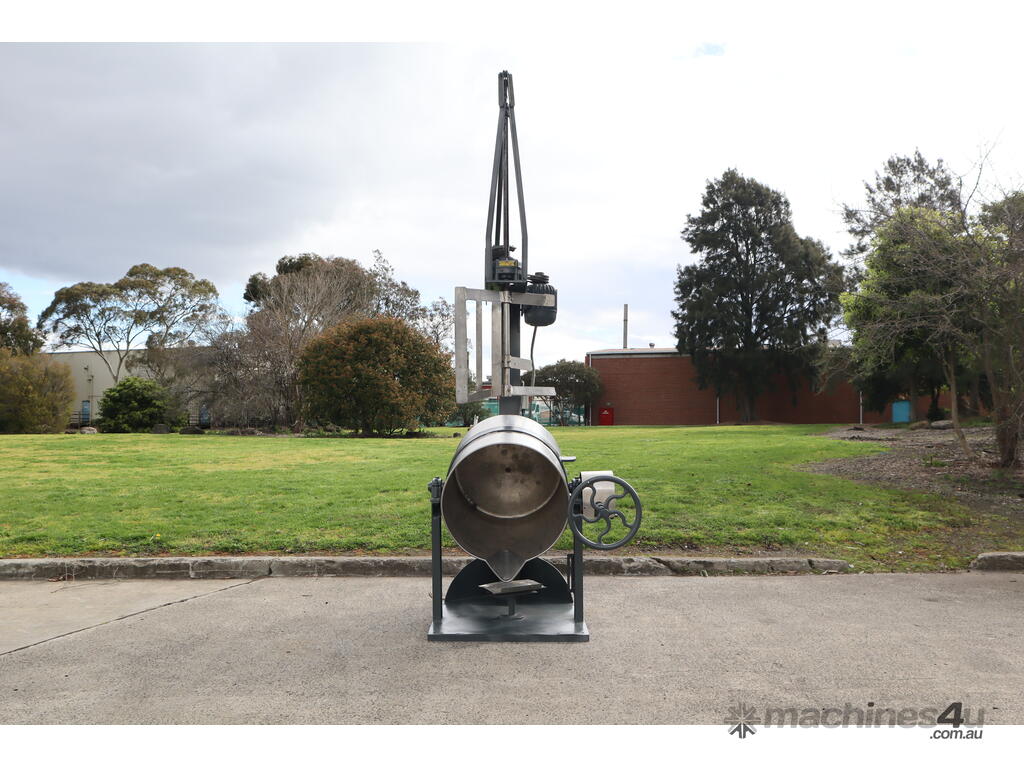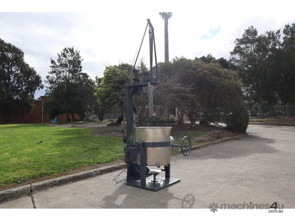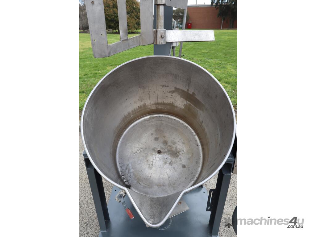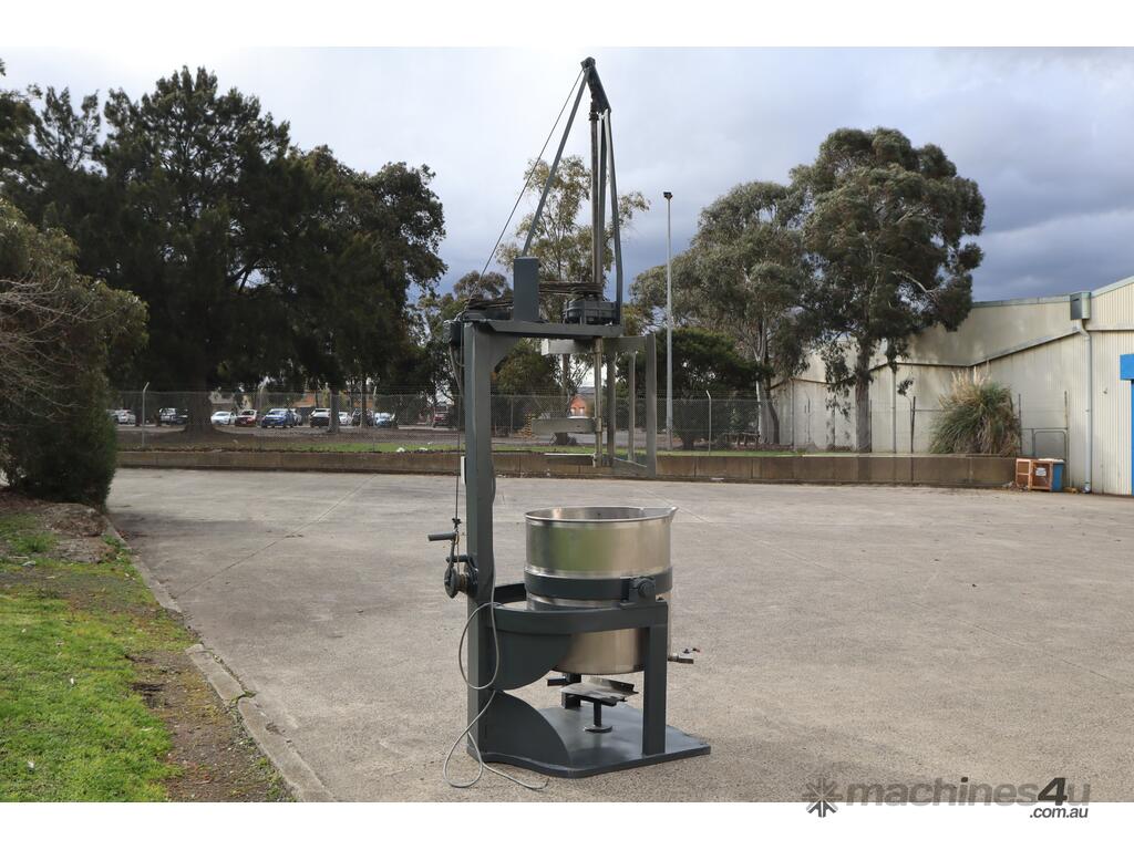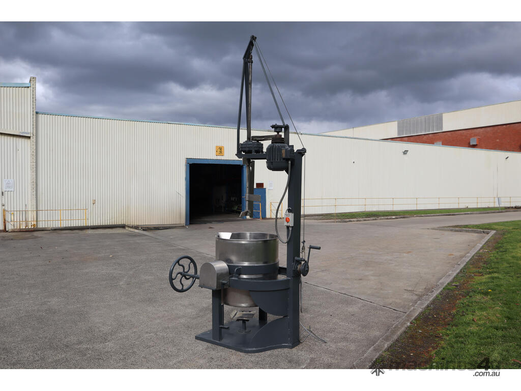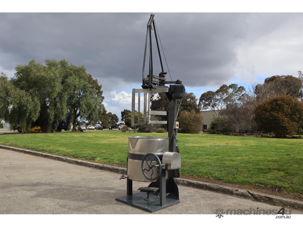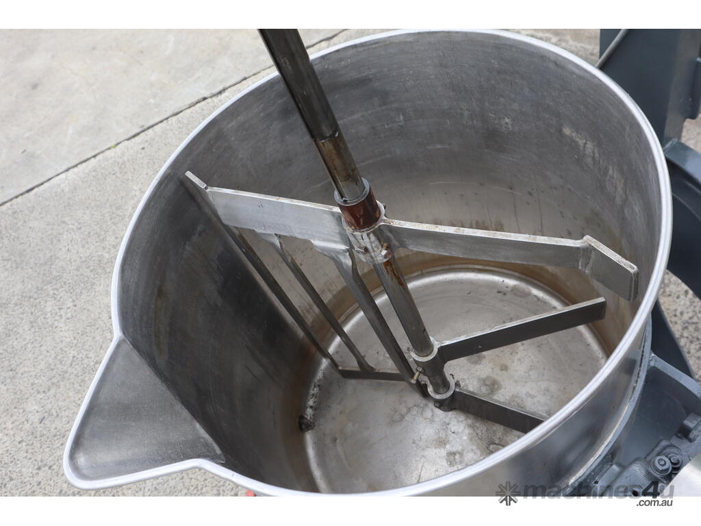 This industrial stainless steel mixing tank features a manual crank system that allows for easy tilting, making simple and safe to empty or transfer contents. Another manual crank is fitting for raising and lowering the mixing blade, allowing for flexibility and control during operation.