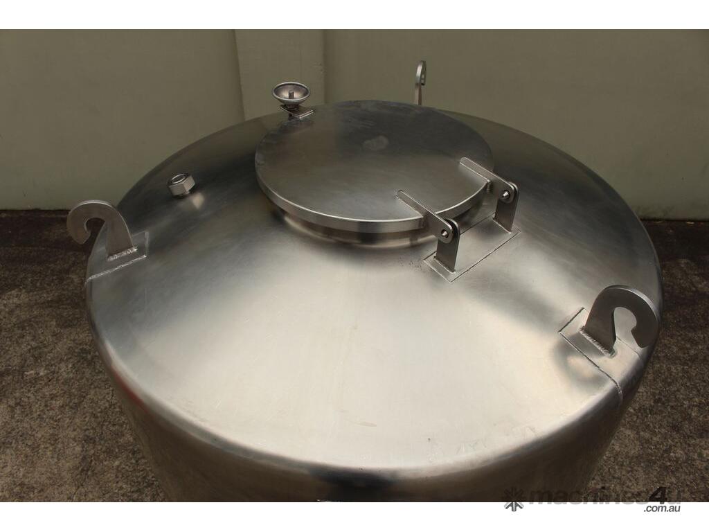 Stainless Steel Tote Bin, "Carlson", capacity 900L, internal dimensions: 1140mm dia x 600mm deep straight wall, 800mm deep cone, totally enclosed with approx. 400mm lockdown manway, conical bottom with 200mm dia centre outlet and cover, all stainless steel frame, mobile, overall height of approx. 1800mm high