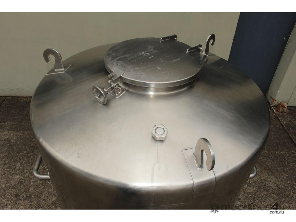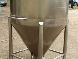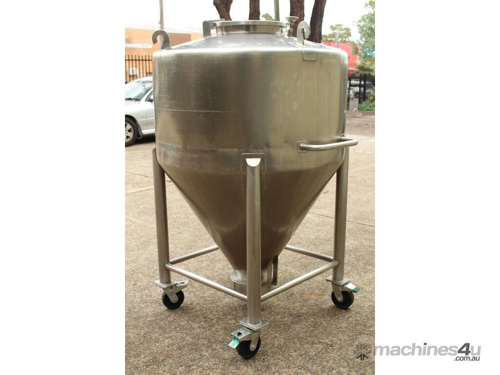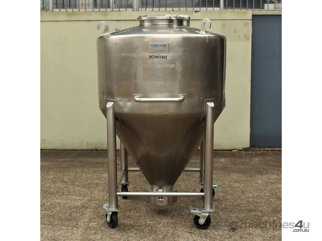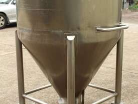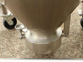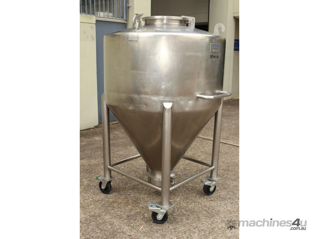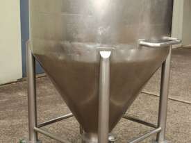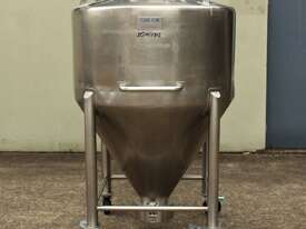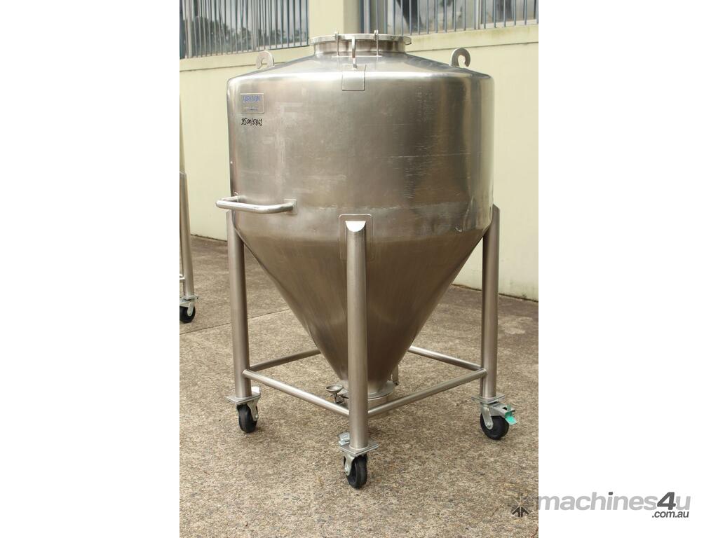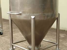 Stainless Steel Tote Bin, "Carlson", capacity 900L, internal dimensions: 1140mm dia x 600mm deep straight wall, 800mm deep cone, totally enclosed with approx. 400mm lockdown manway, conical bottom with 200mm dia centre outlet and cover, all stainless steel frame, mobile, overall height of approx. 1800mm high