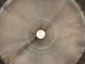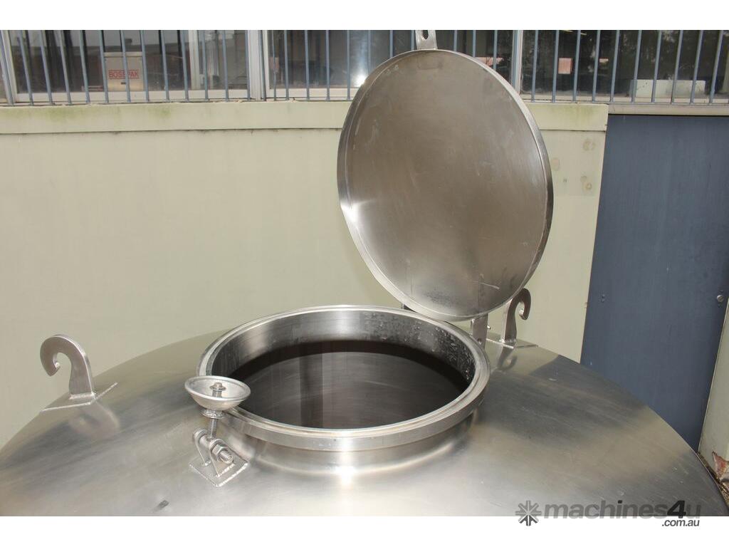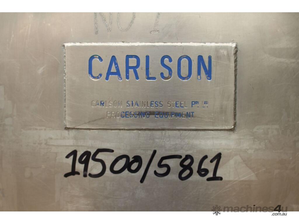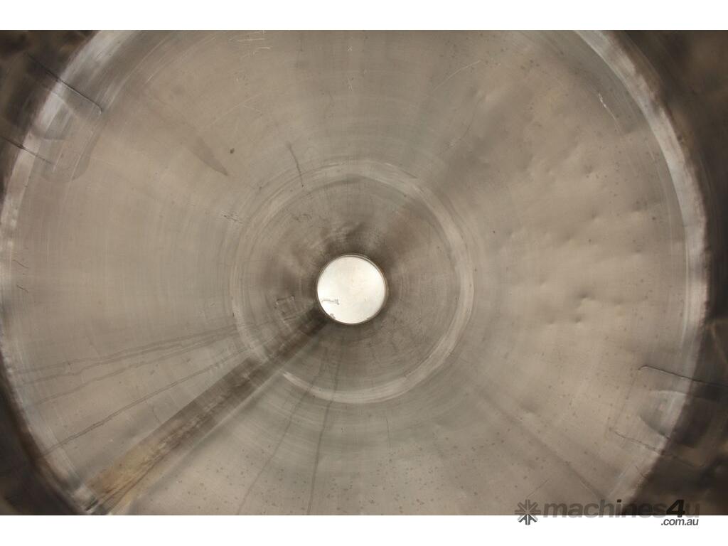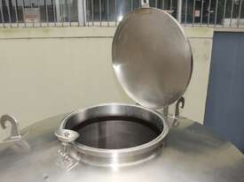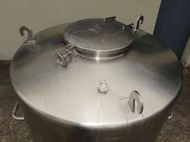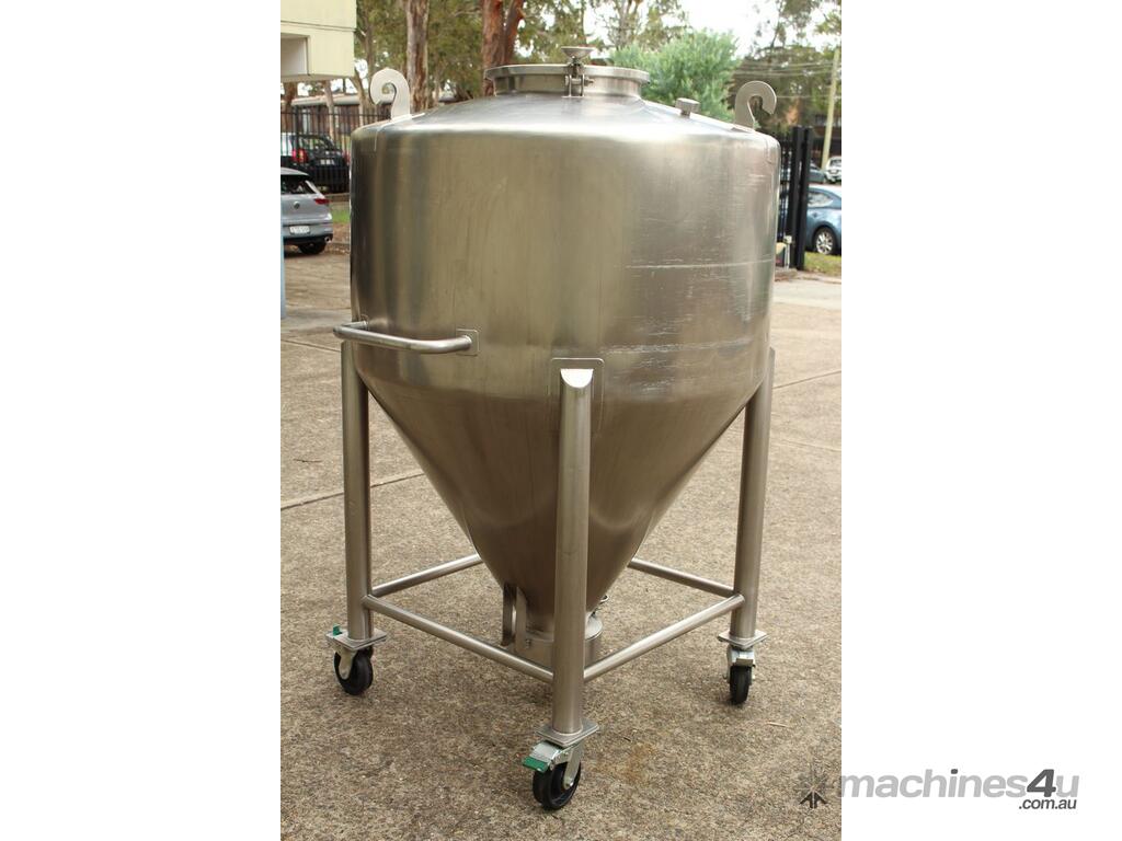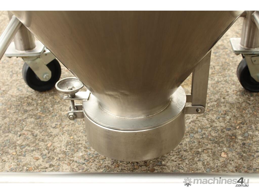 Stainless Steel Tote Bin, "Carlson", capacity 900L, internal dimensions: 1140mm dia x 600mm deep straight wall, 800mm deep cone, totally enclosed with approx. 400mm lockdown manway, conical bottom with 200mm dia centre outlet and cover, all stainless steel frame, mobile, overall height of approx. 1800mm high