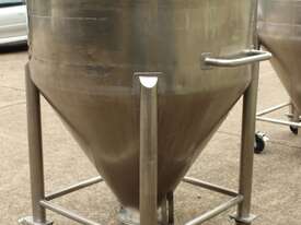 Stainless Steel Tote Bin, "Carlson", capacity 900L, internal dimensions: 1140mm dia x 600mm deep straight wall, 800mm deep cone, totally enclosed with approx. 400mm lockdown manway, conical bottom with 200mm dia centre outlet and cover, all stainless steel frame, mobile, overall height of approx. 1800mm high