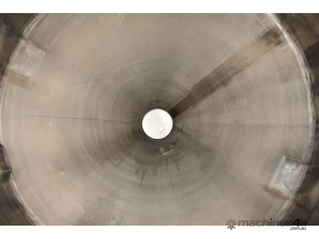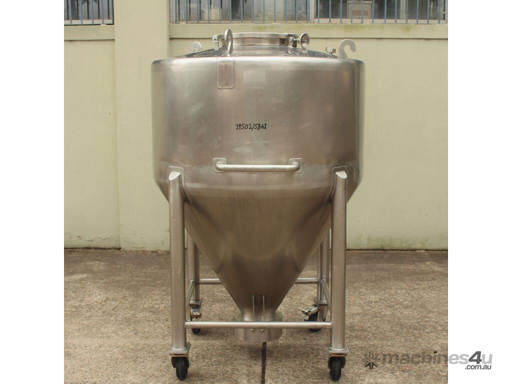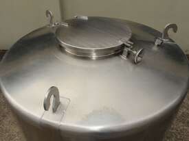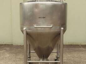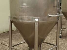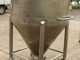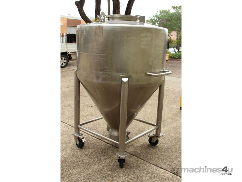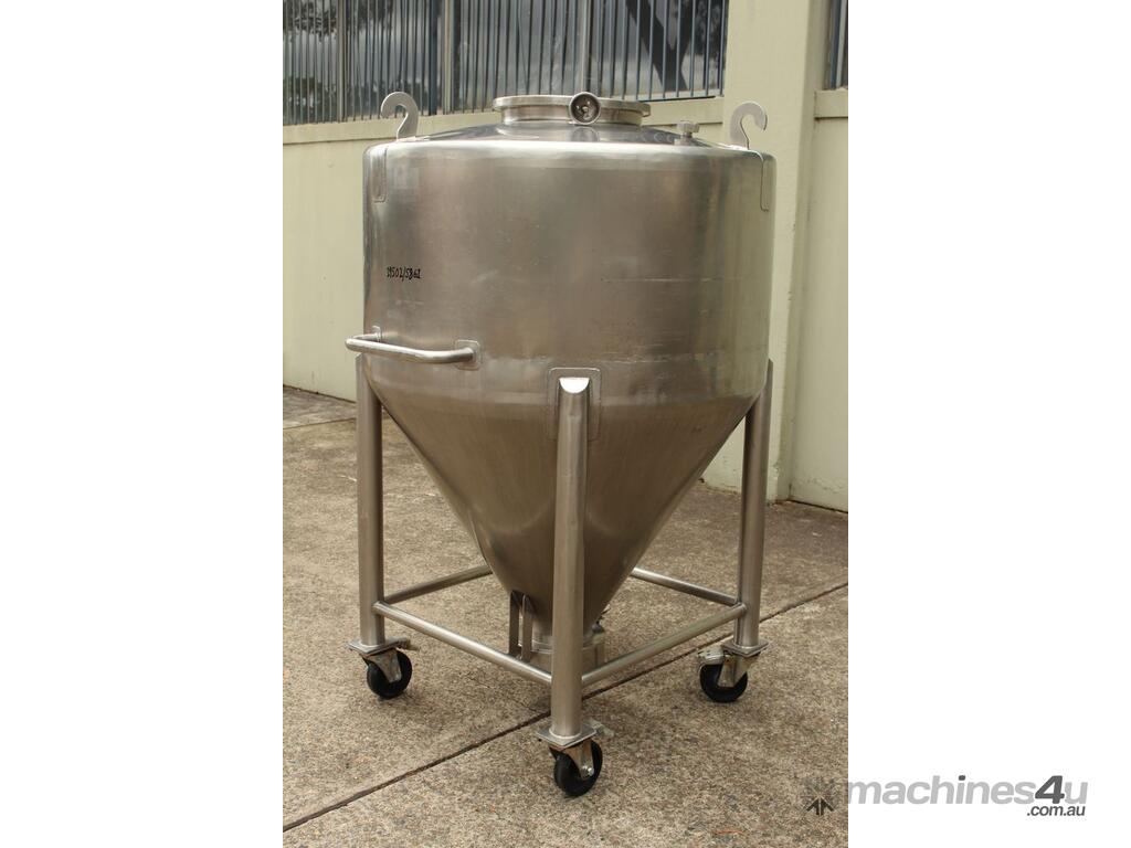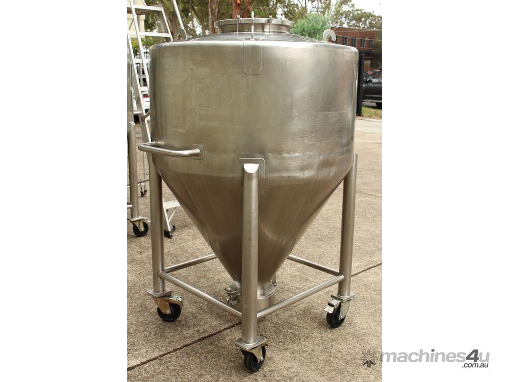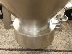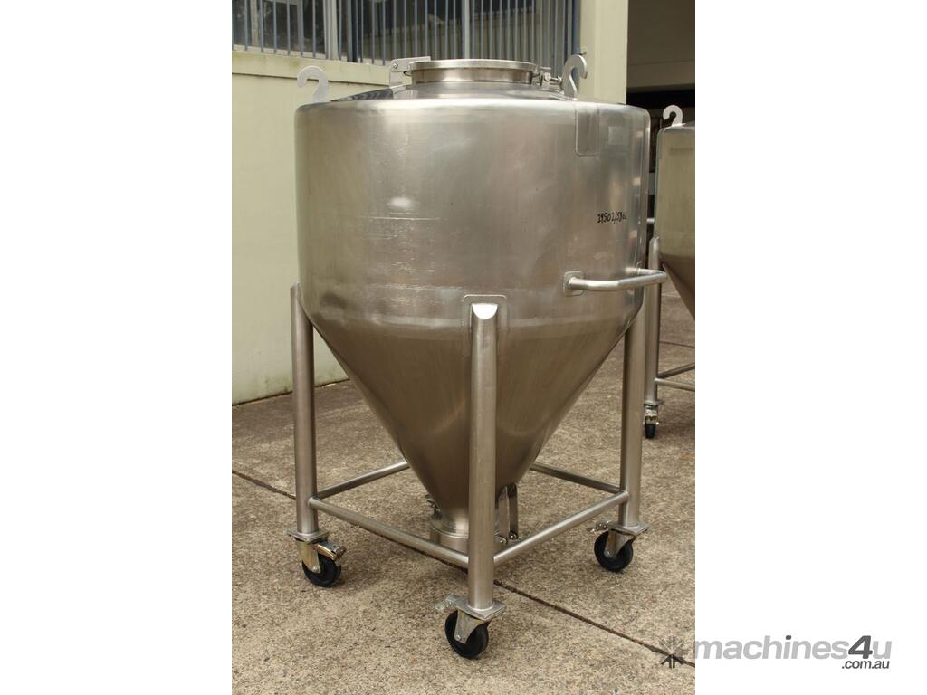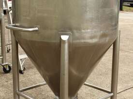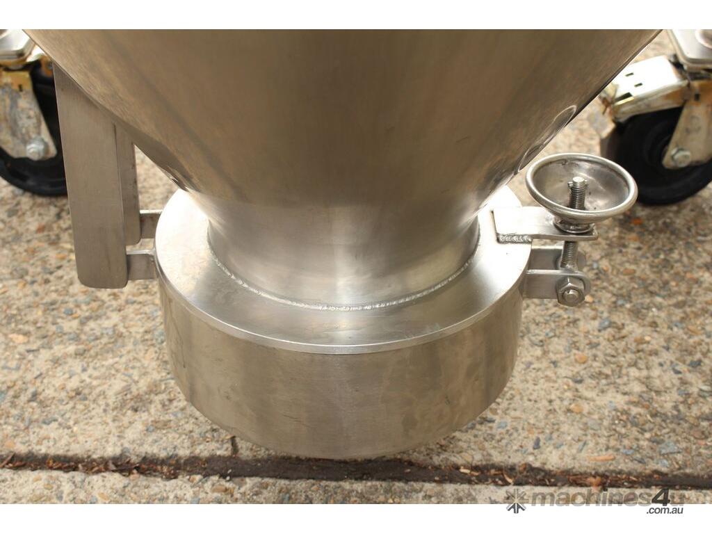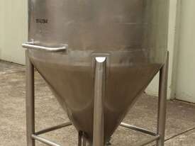 Stainless Steel Tote Bin, "Carlson", capacity 900L, internal dimensions: 1140mm dia x 600mm deep straight wall, 800mm deep cone, totally enclosed with approx. 400mm lockdown manway, conical bottom with 200mm dia centre outlet and cover, all stainless steel frame, mobile, overall height of approx. 1800mm high