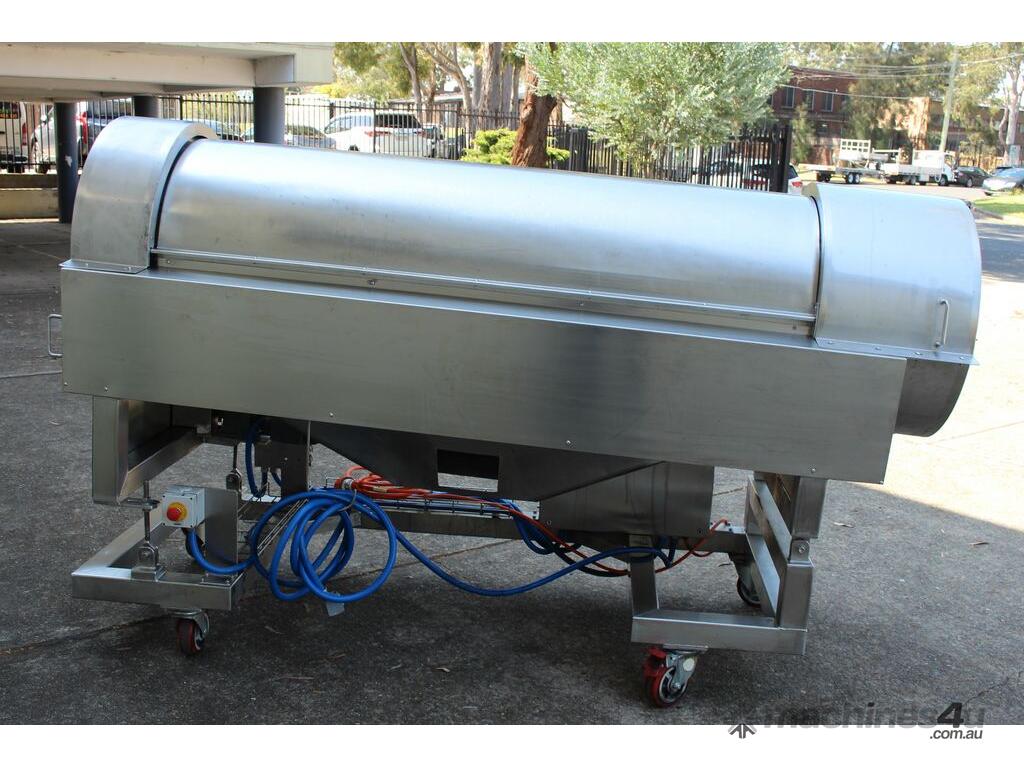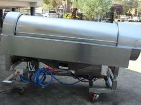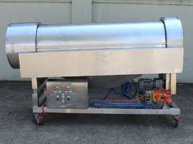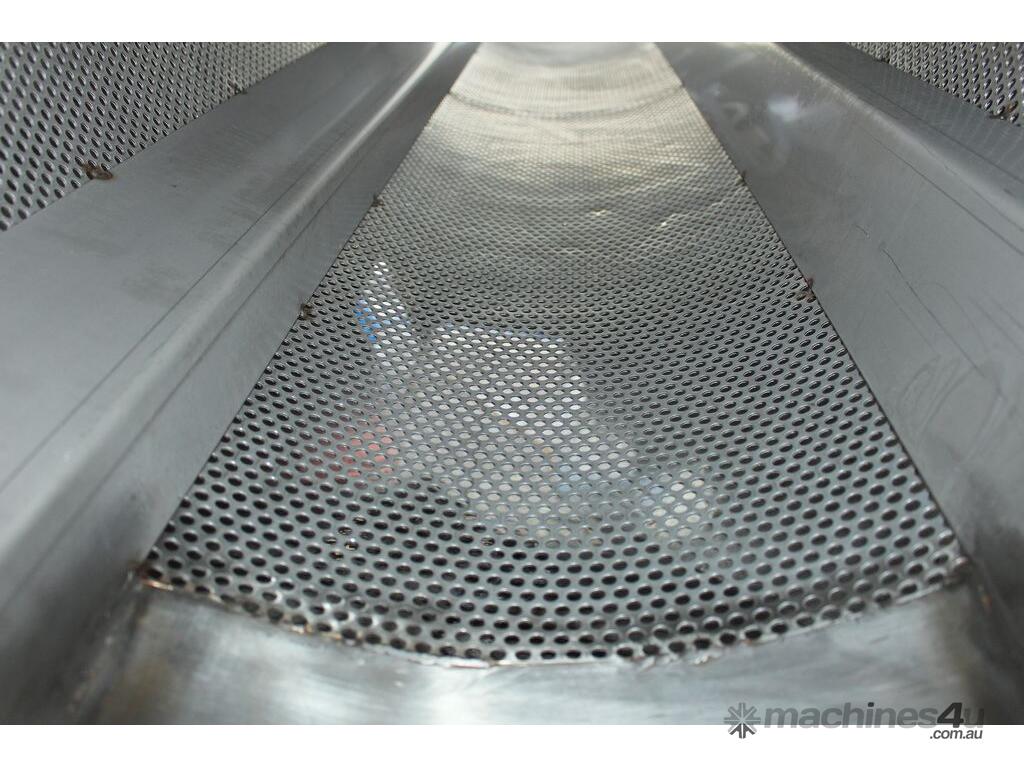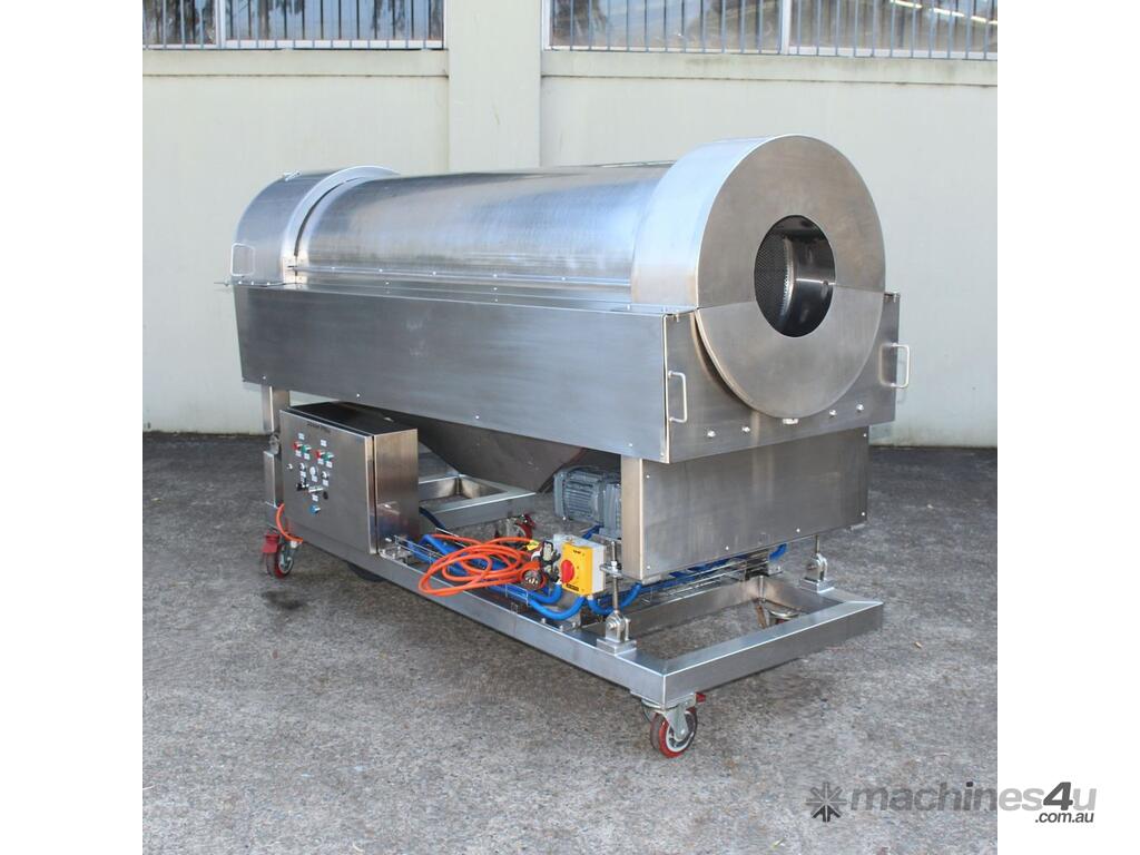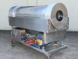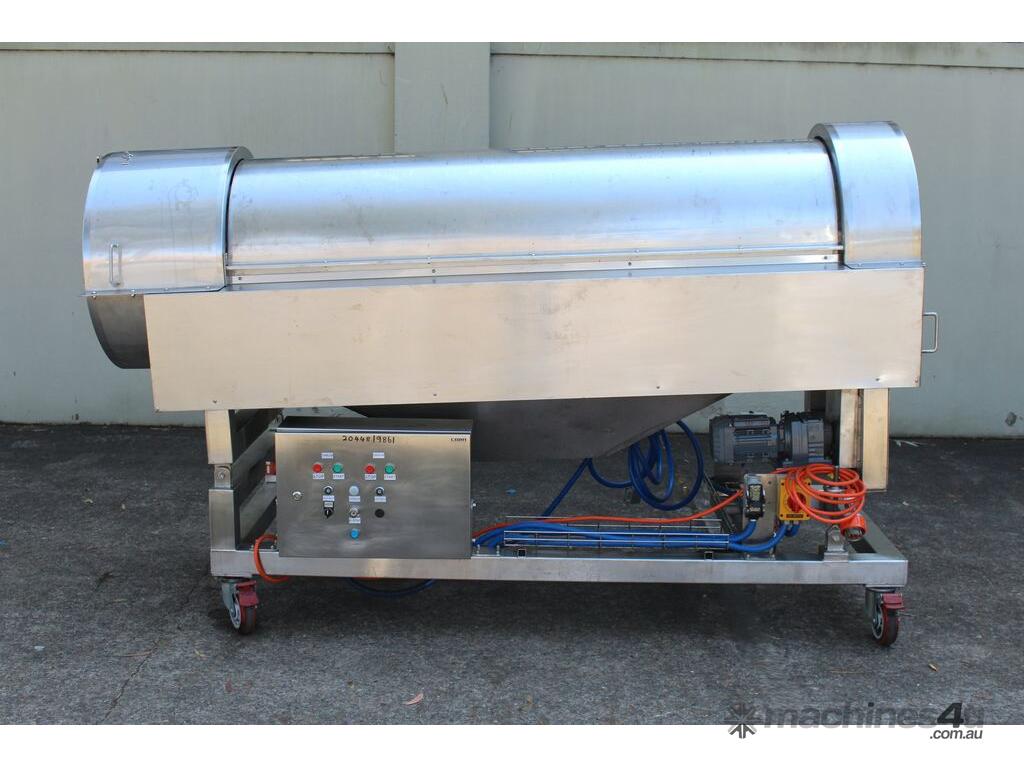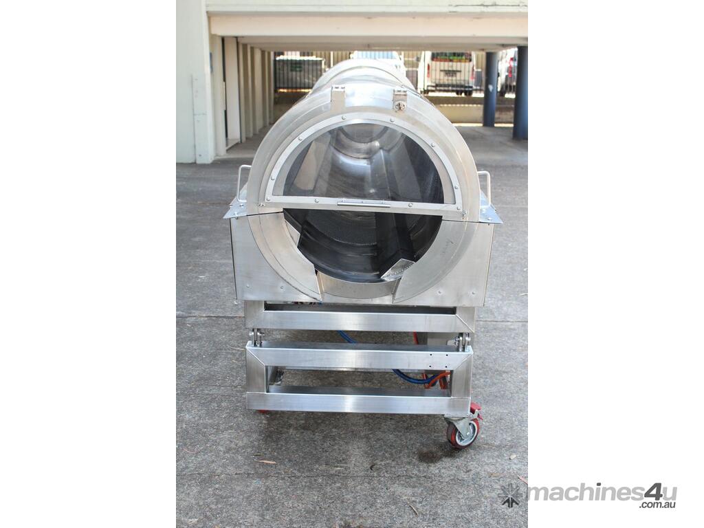 Stainless Steel Trommel Drum Rotary Screen, internal drum dimensions 580mm diameter x 2560mm long, perforated with 5mm mesh screen and fitted with 4 longitudinal baffles, completely enclosed design with bottom discharge hopper for residuals, driven by 3 phase geared motor, supplied complete with control panel, all stainless steel construction on mobile frame, overall dimensions 950mm wide x 2600mm long x 1650mm high, suitable for screening, separation and product grading applications