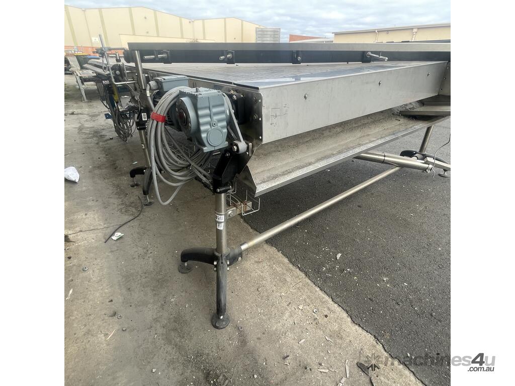 Stainless plastic link belt conveyor system bottling product accumulator accumulation and conveyor merge station.