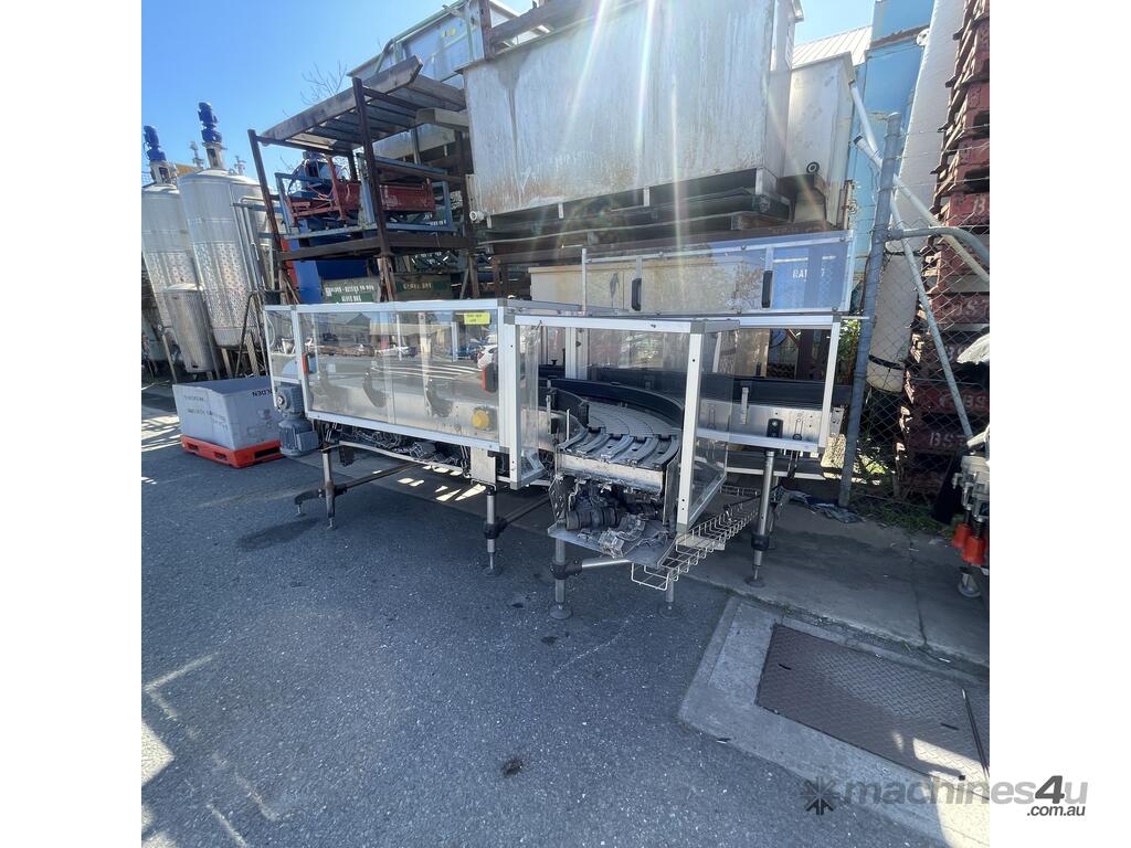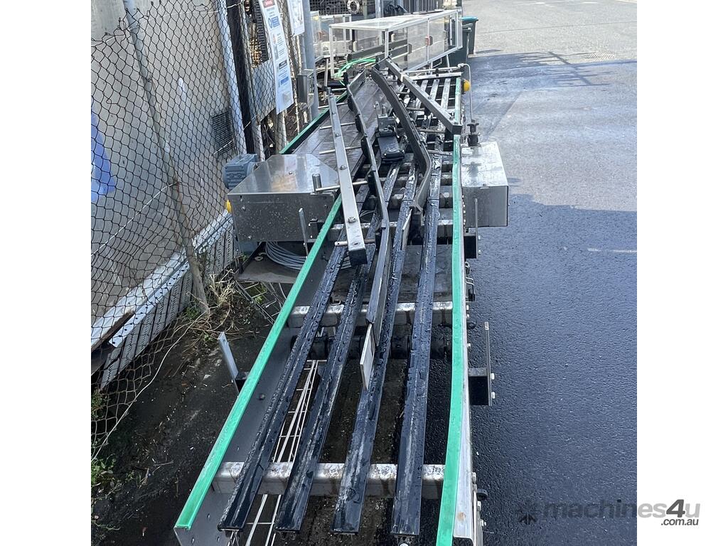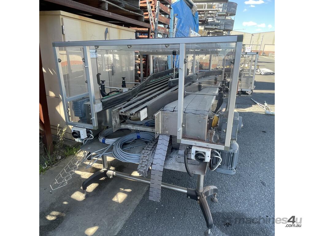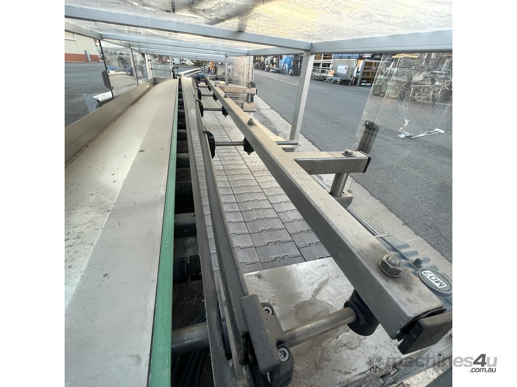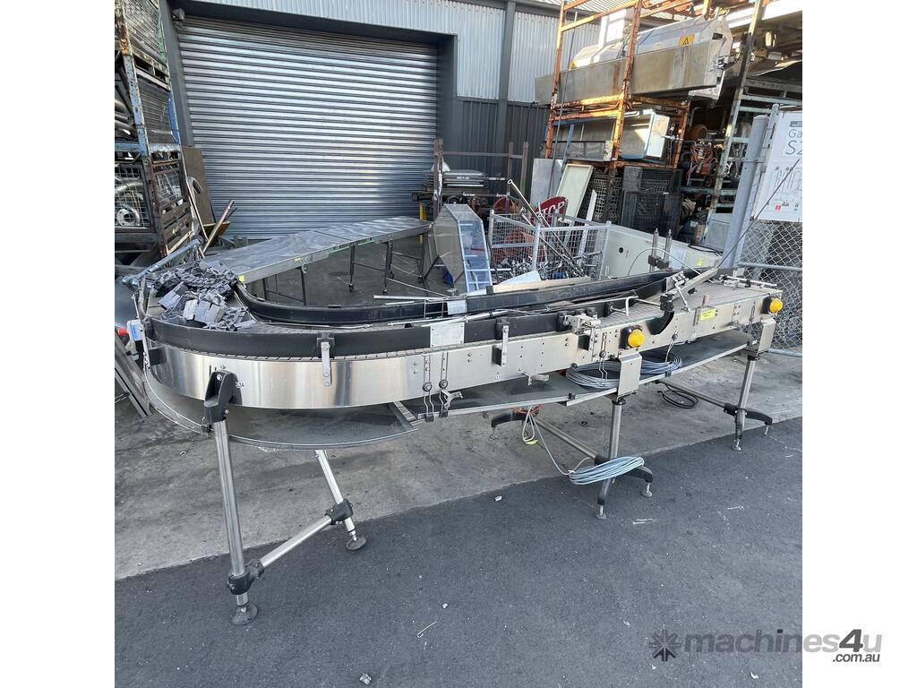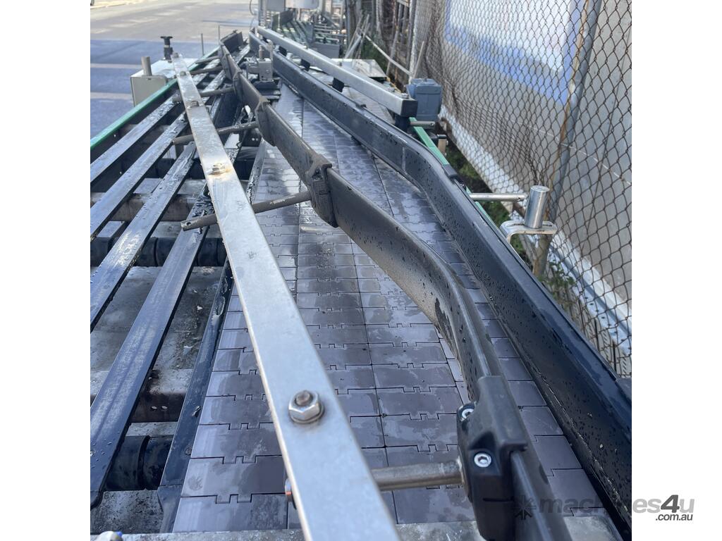 Stainless plastic link belt conveyor system bottling product with accumulator accumulation and conveyor merge sections.