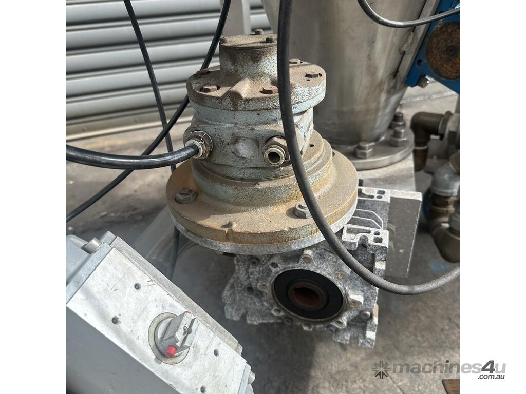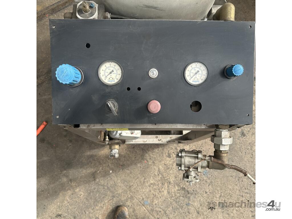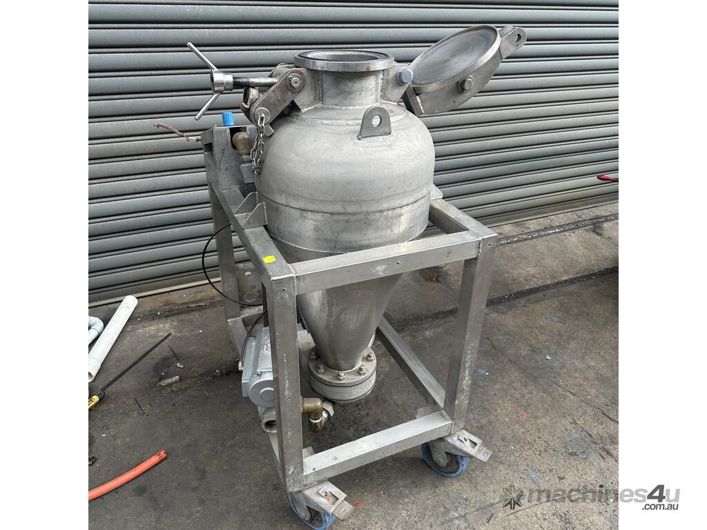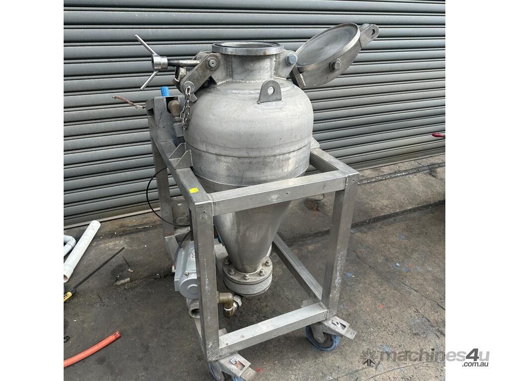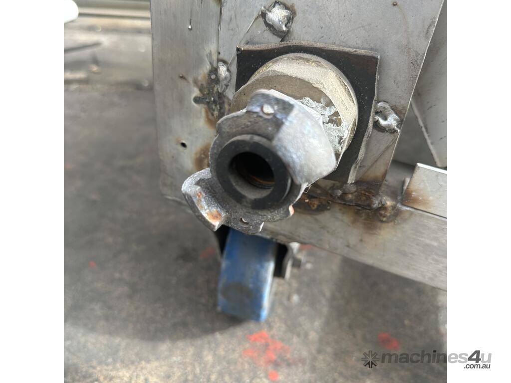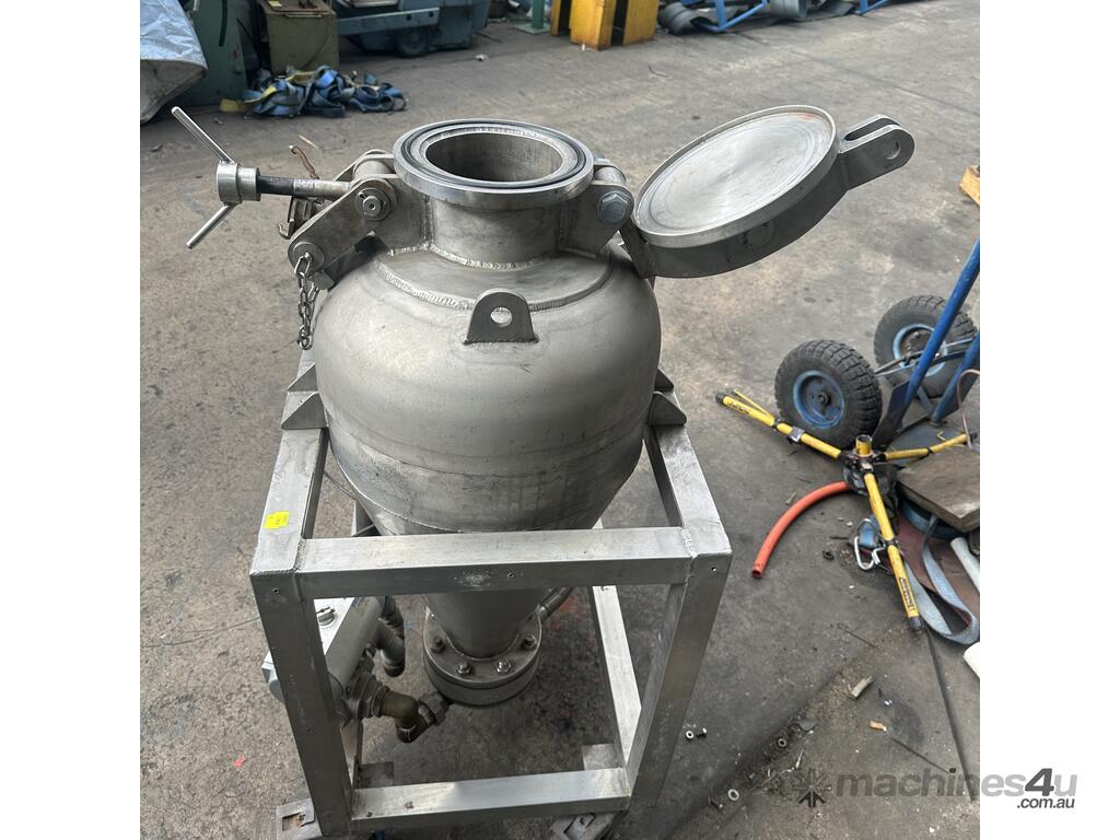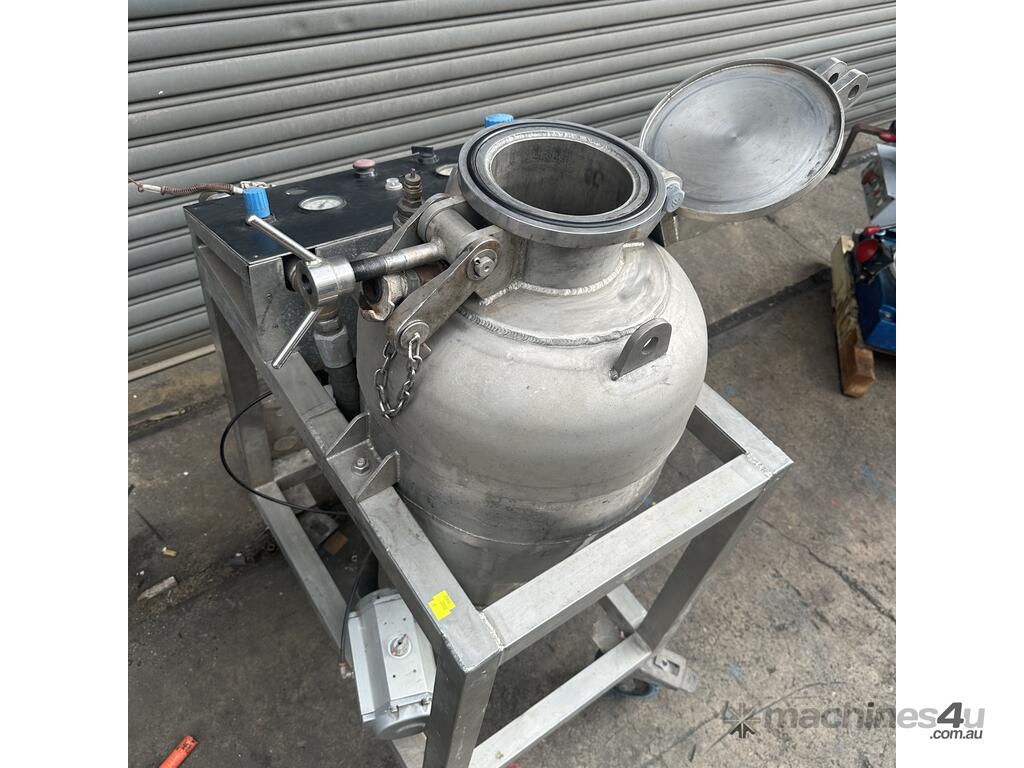 Stainless steel pressure vessel pot hopper with an air motor driven masher and has a air driven vibrator on side of vessel.