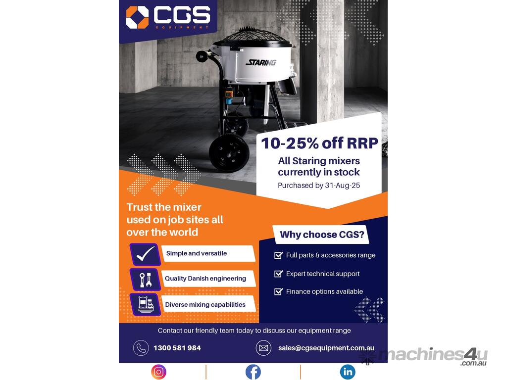 If you work with concrete day in and day out, you know your gear matters. That’s why CSG Equipment are proud to bring you the Staring STB200 Electric Pan Mixer. Built in Europe and ready for the toughest pours, this machine is engineered for strength, simplicity, and serious performance on-site.