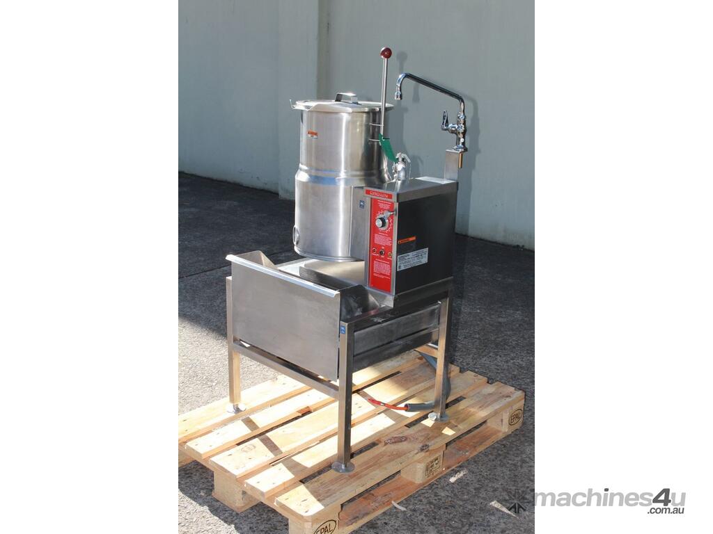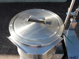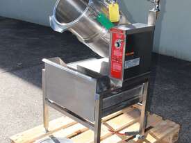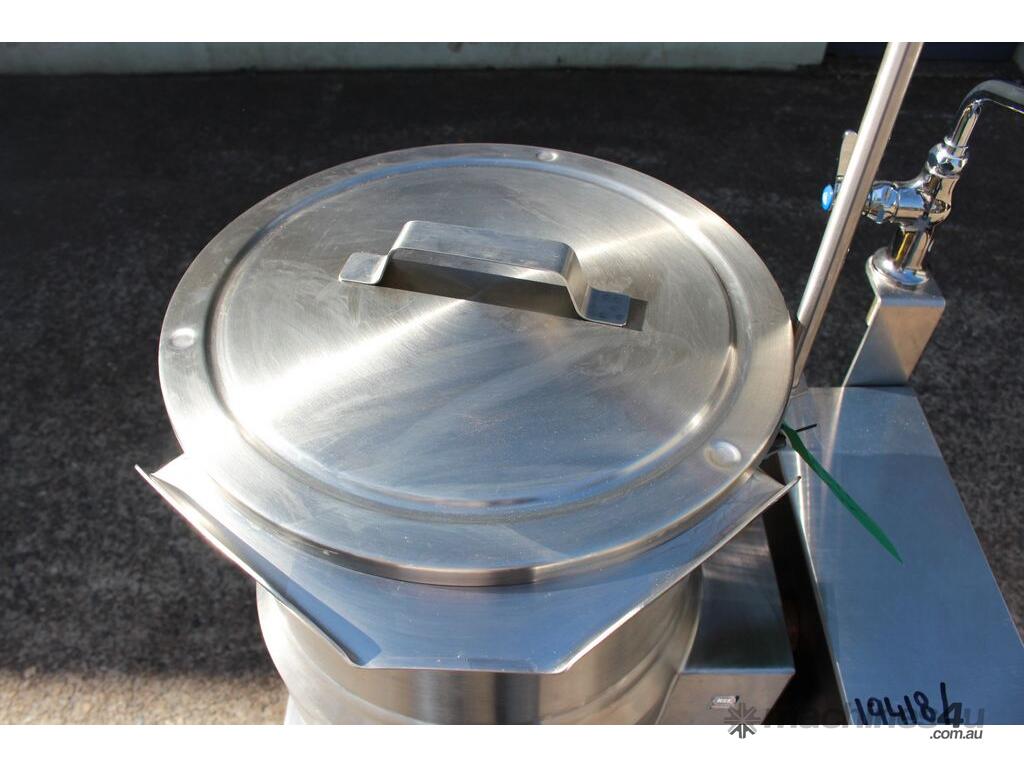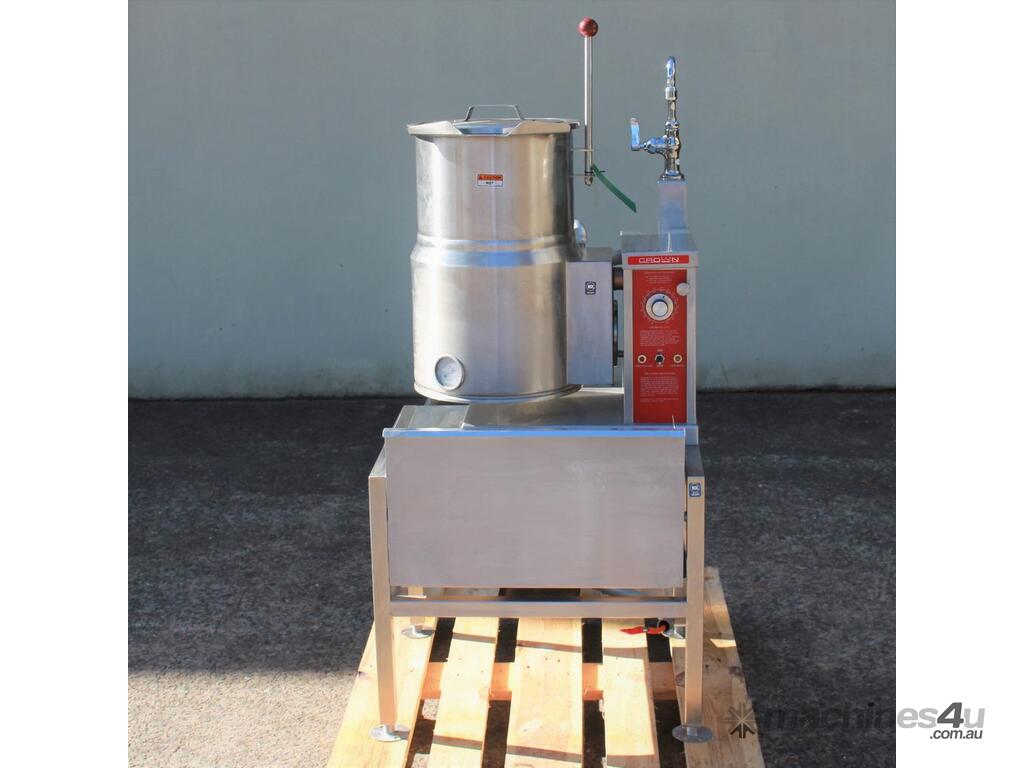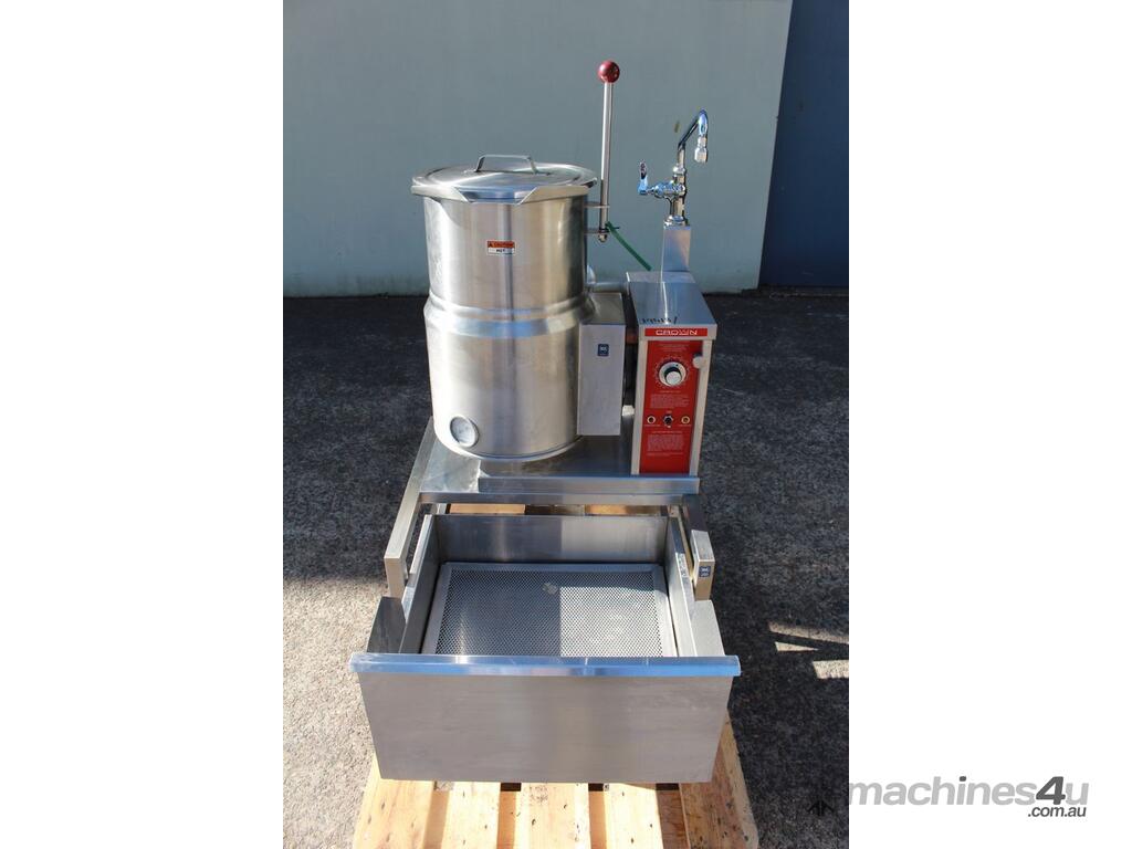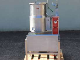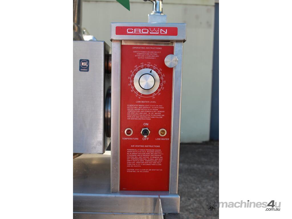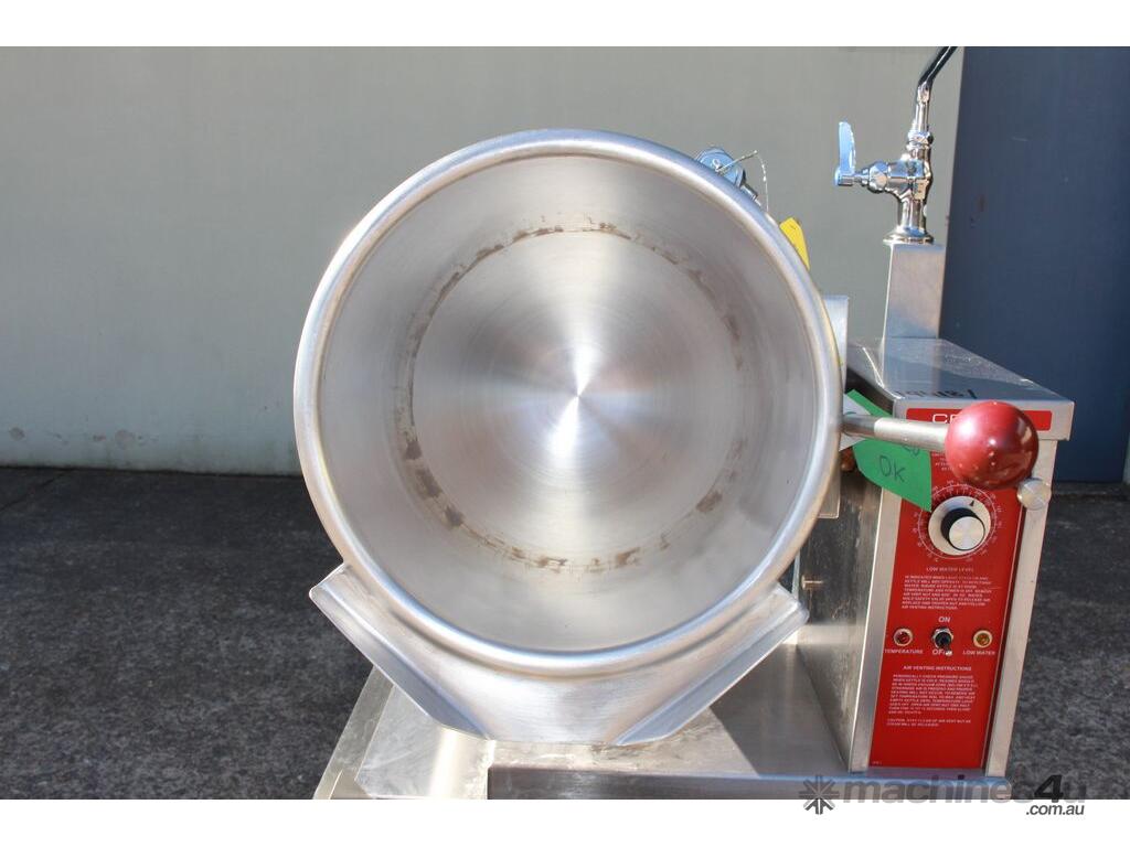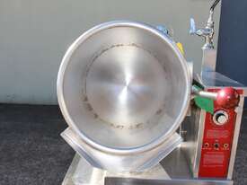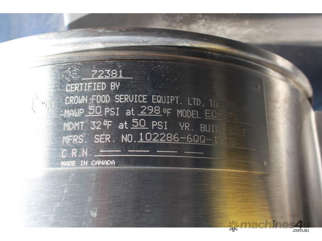 Steam Jacketed Electric Tilting Kettle, "Crown" model EC-6WT, 23L capacity, kettle internal dimensions: 300mm dia x 370mm deep, open top with lid, max. working pressure 50psi 298 deg F, 3 phase 7.5kw, low water level cut-off and indicator, complete stainless steel, built year 2019