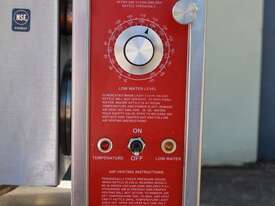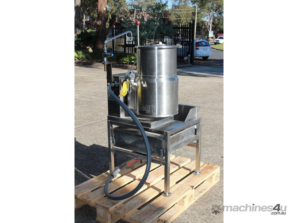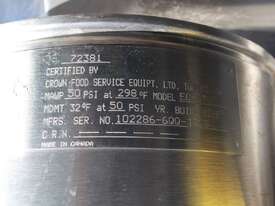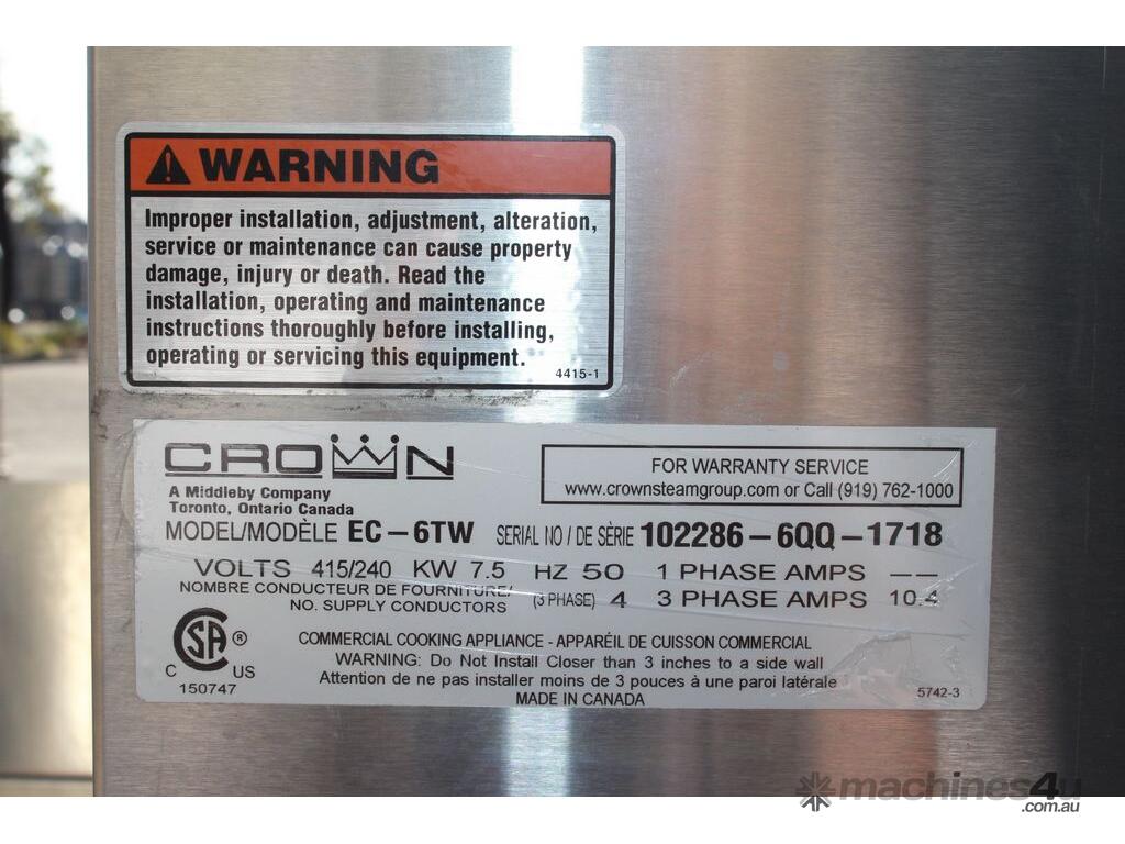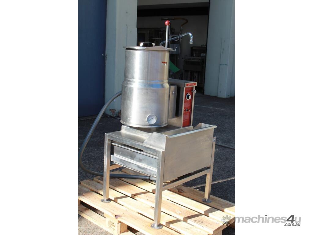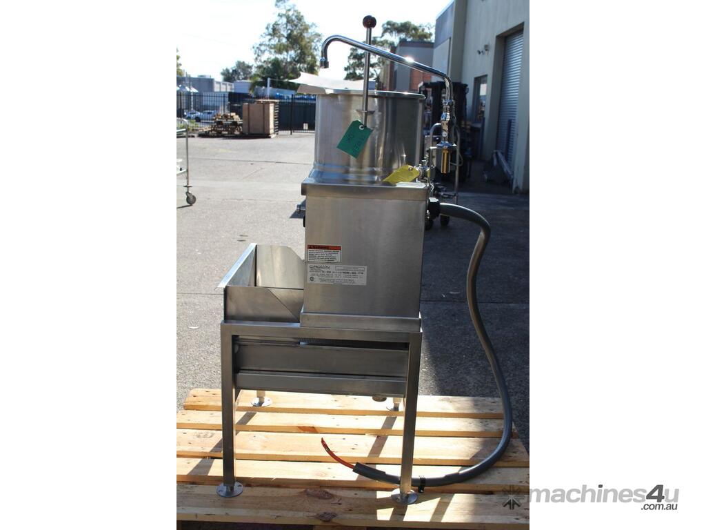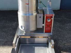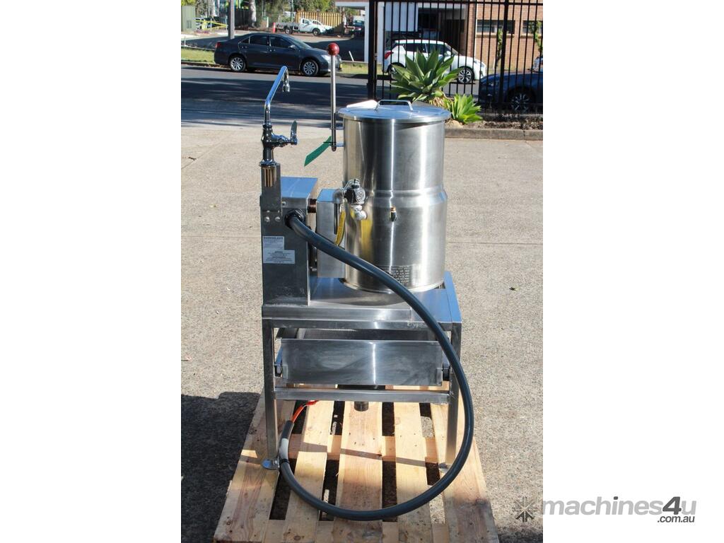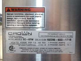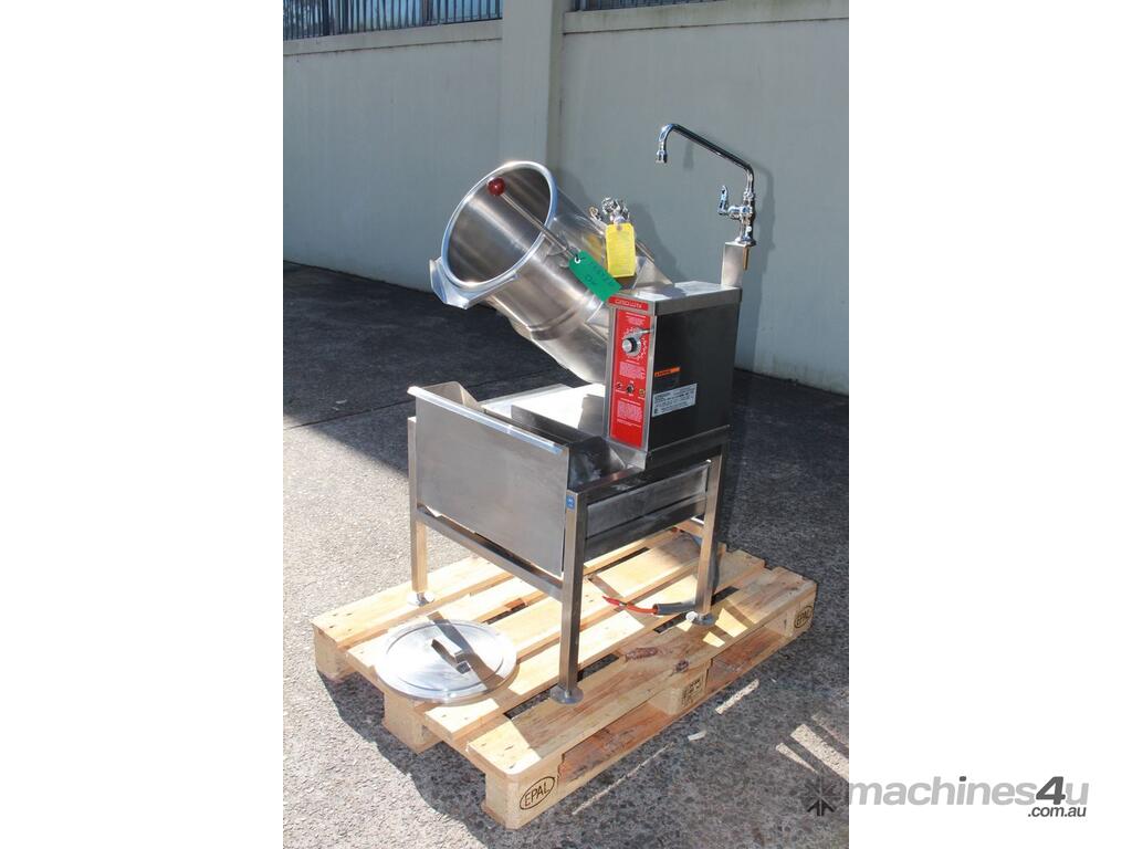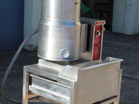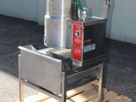 Steam Jacketed Electric Tilting Kettle, "Crown" model EC-6WT, 23L capacity, kettle internal dimensions: 300mm dia x 370mm deep, open top with lid, max. working pressure 50psi 298 deg F, 3 phase 7.5kw, low water level cut-off and indicator, complete stainless steel, built year 2019