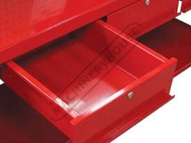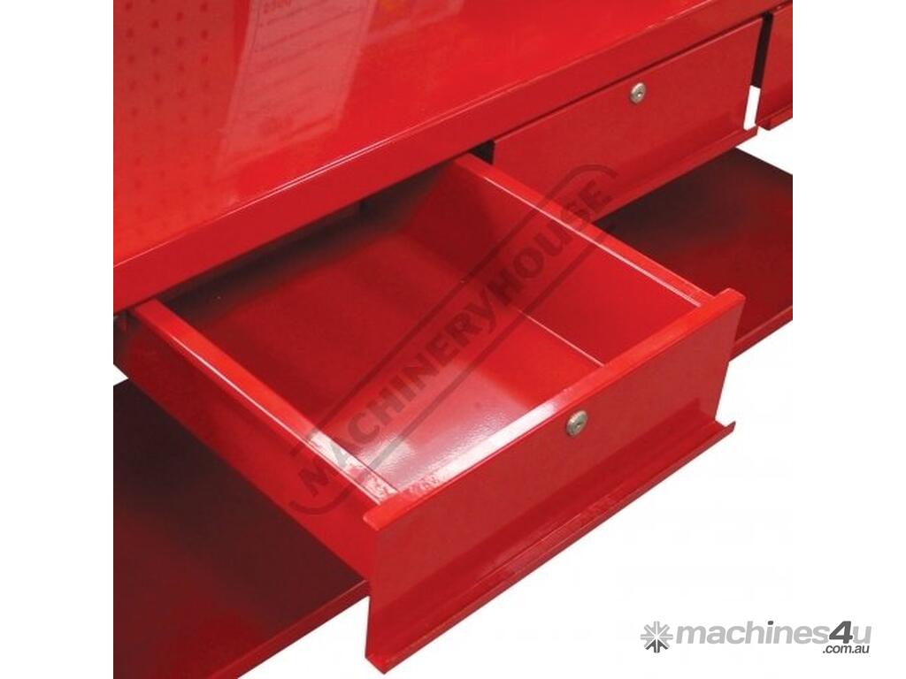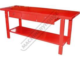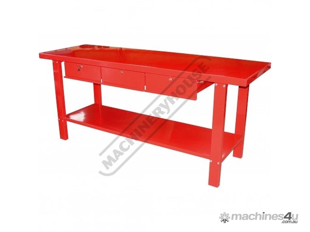 Solid steel construction, 2 metres of bench top with 3 lockable drawers, plus huge shelf storage below, great for the workshop or garage.
