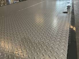 The bi-fold ramp is powered by a 12V battery power pack and includes a raise-lower valve for easy operation. LED lighting enhances visibility, while the black body with a silver chassis gives the trailer a sleek and professional appearance. A spare wheel carrier, all necessary safety signs, a hydraulic ramp system, front gate, and side gate pockets add to the trailer's practicality and safety. Note that this model does not include a road train setup or a ring feeder.