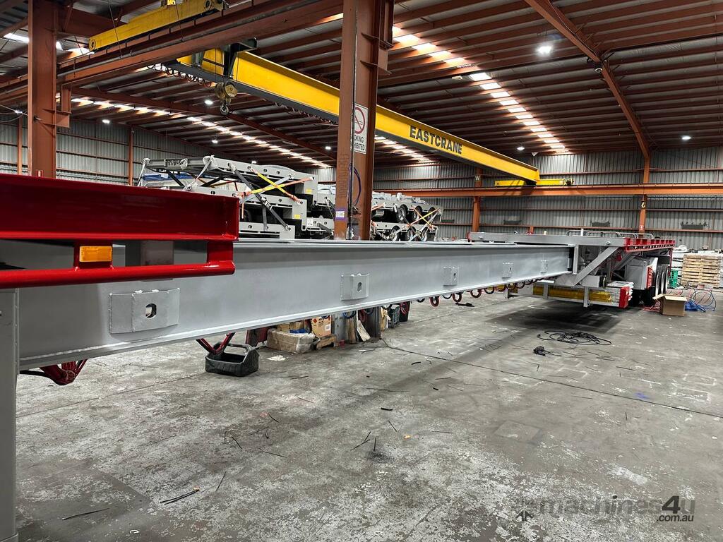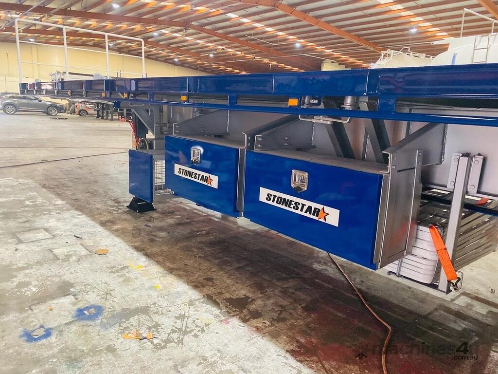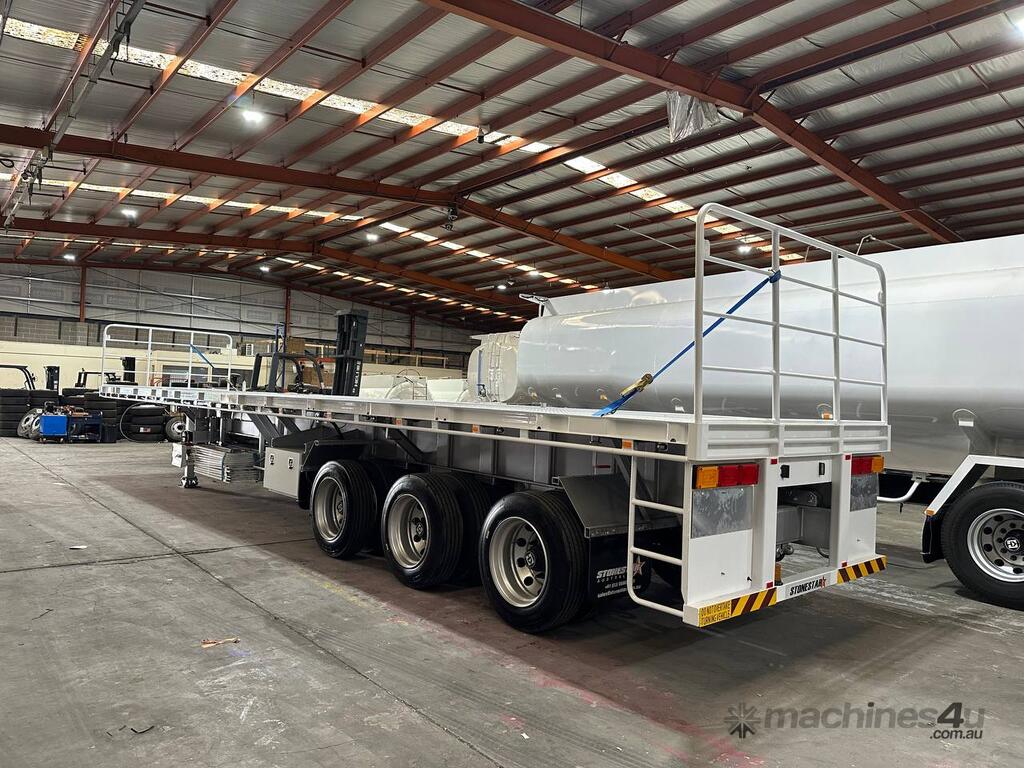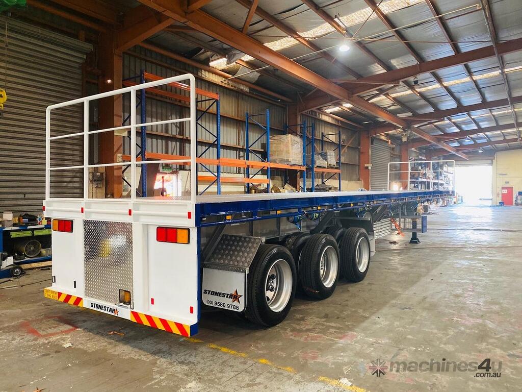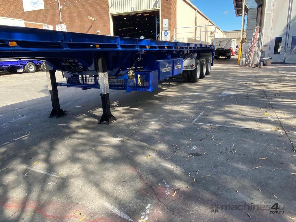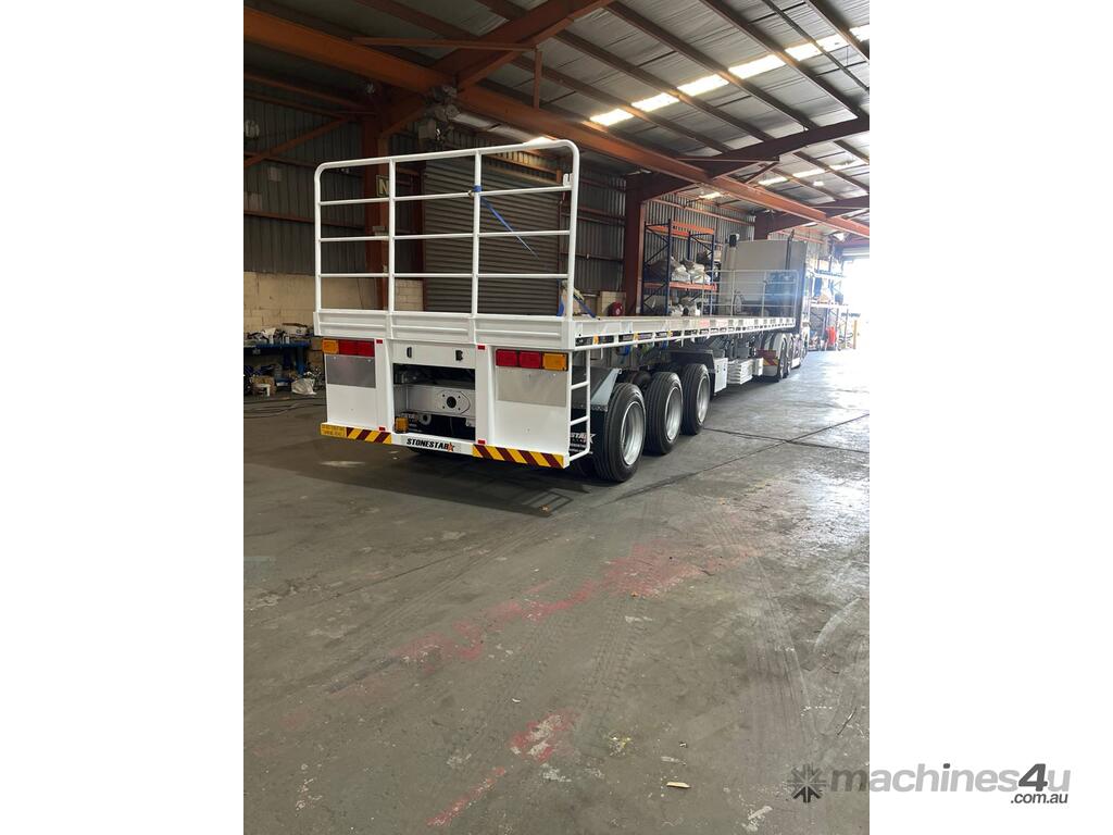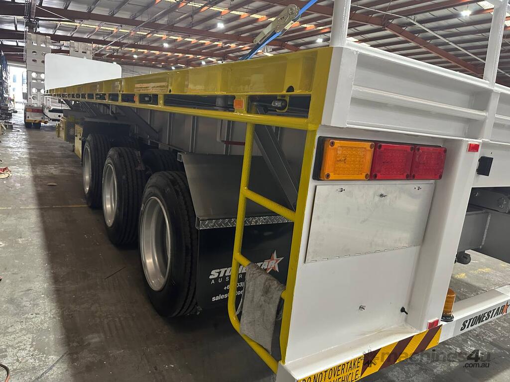 Introducing the brand new Stonestar Extendable Flat Top trailer, designed to provide unparalleled versatility and strength for your transport needs. This trailer extends from 13.575 meters to an impressive 19.6 meters, accommodating a wide range of cargo sizes. With a 40-tonne ATM capacity, it is built to handle heavy loads with ease. The trailer features an auto air-controlled locking pin, ensuring secure extension and retraction. The checker-plate steel floor and high tensile steel chassis offer exceptional durability and reliability.