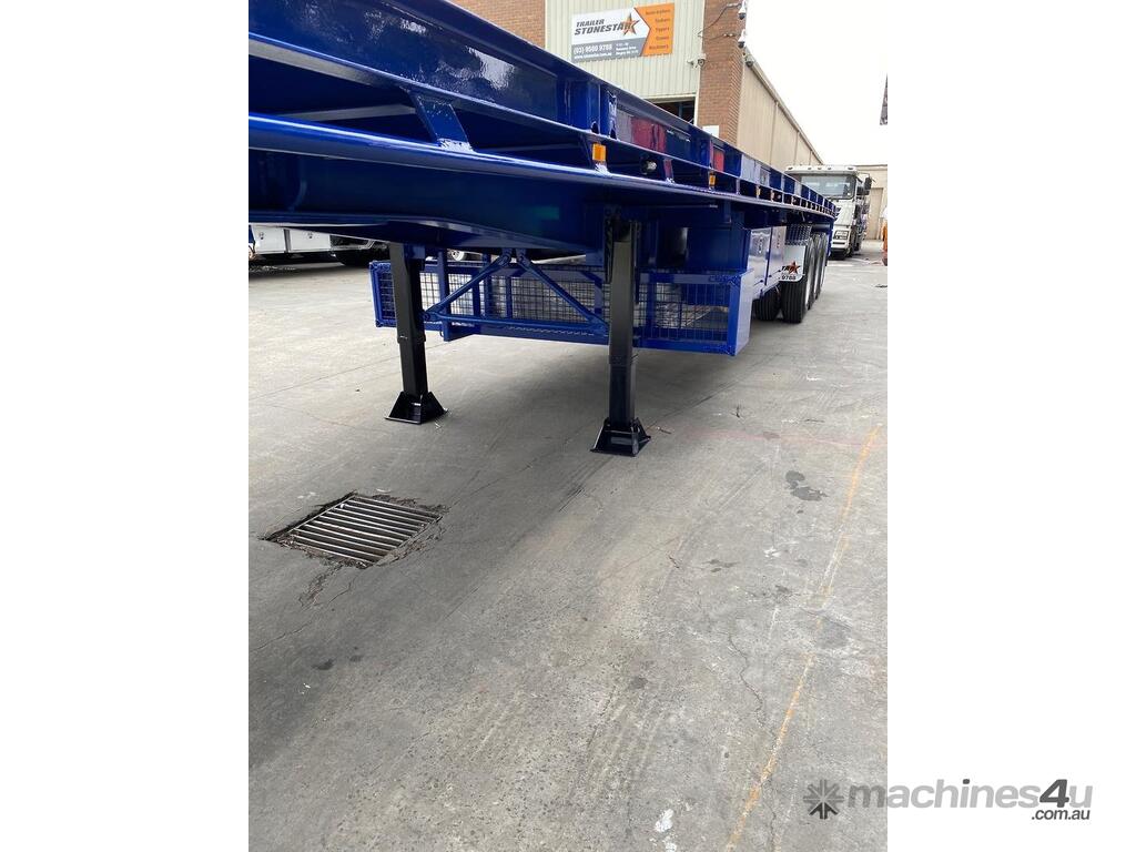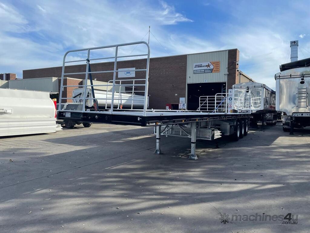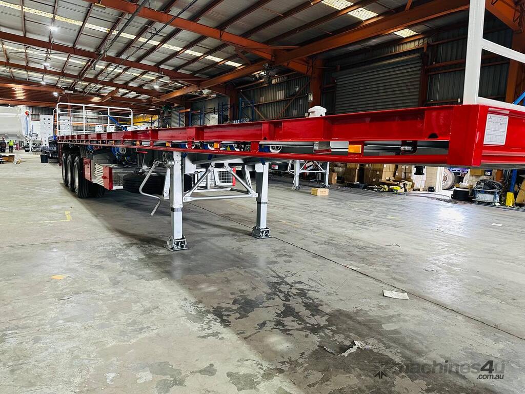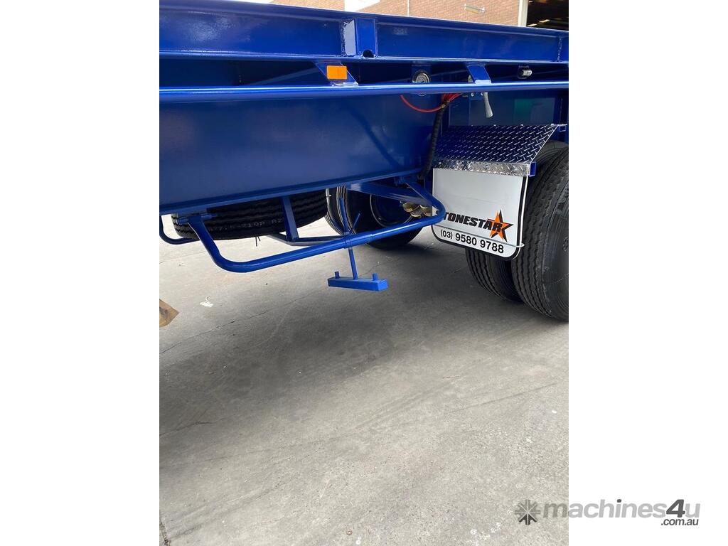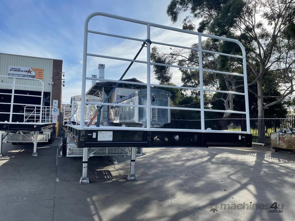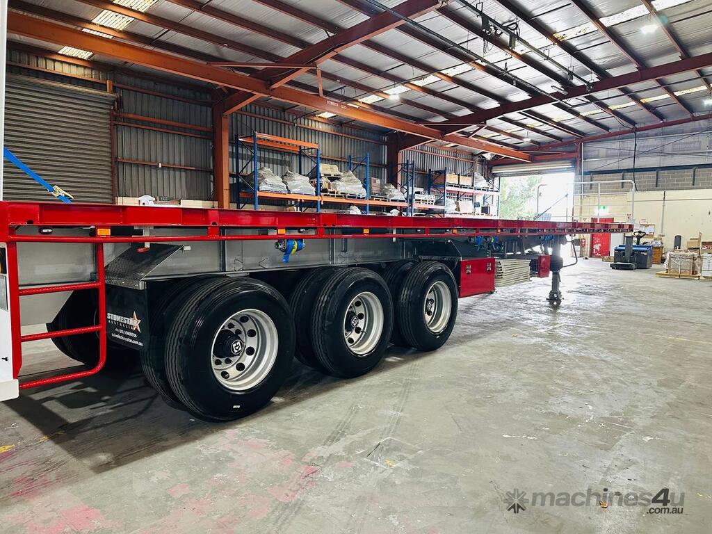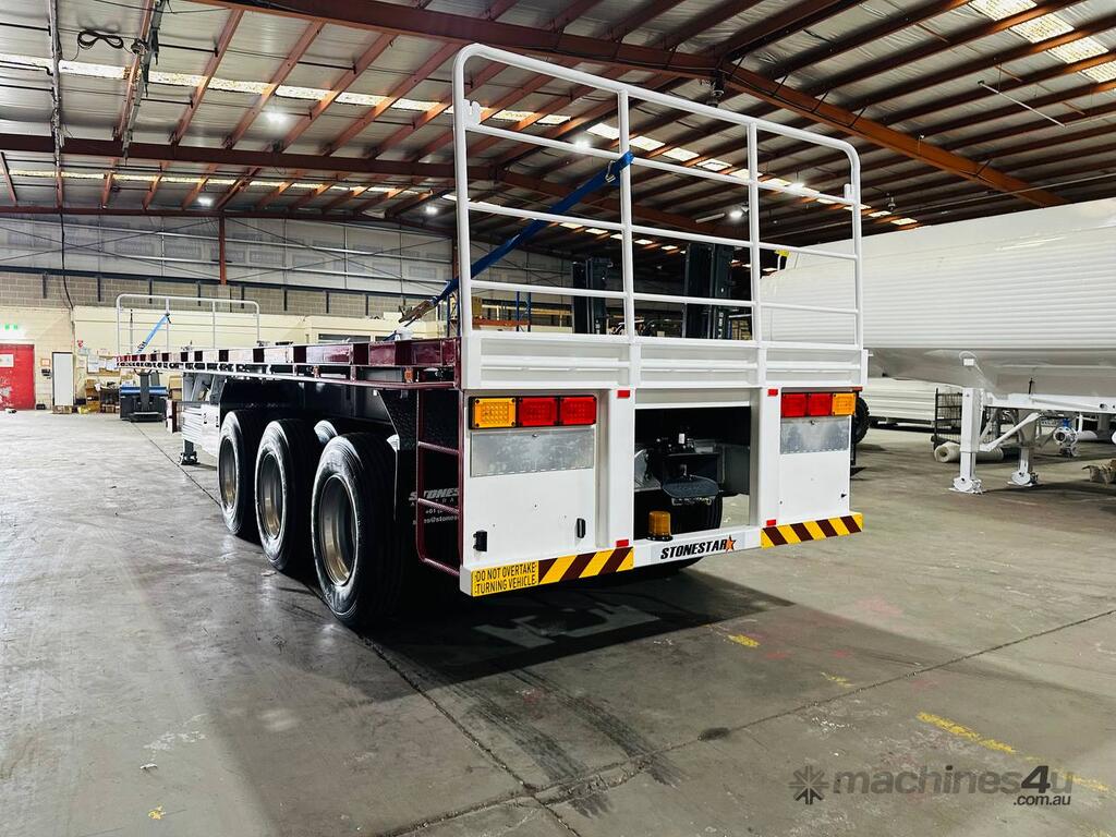 Introducing the brand new Stonestar Flat Top 45 Foot trailer, built to offer superior strength and versatility for your heavy-duty transport needs. With a 40-tonne ATM capacity, this trailer is equipped with a checker-plate steel floor and a high-standard steel chassis, ensuring durability and reliability. It features side gate pockets and 3-way container pins, providing flexibility for securing various types of cargo.
