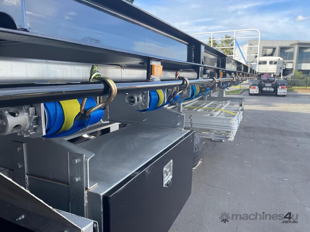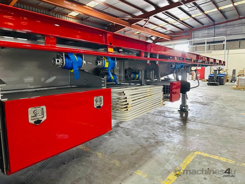 The heavy-duty K-Hitch axle and air bag suspension deliver a smooth and stable ride, while the raise-lower valve, Jost 2-speed legs, and Jost 2-position king pin enhance operational efficiency. The trailer also includes LED lights for improved visibility. For additional customization, timber boxes and gates are available at extra cost. The trailer is finished with a two-pack paint coating for added durability, and it features an ADR-approved Australian brake system.