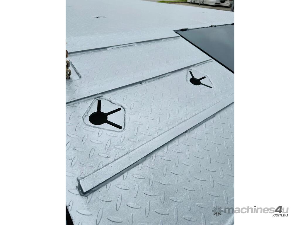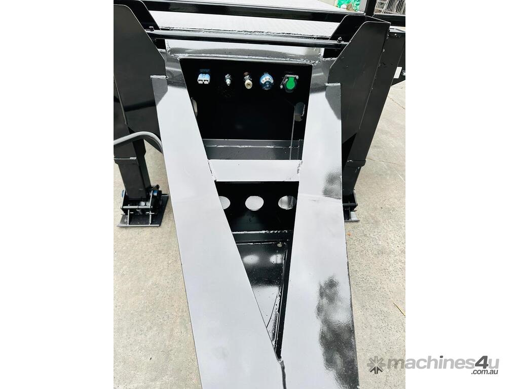 The trailer includes a toolbox for convenient storage and a checker plate steel floor for added strength and durability. Straight ramps facilitate easy loading and unloading, while the 2-speed landing legs offer stability and ease of use. LED lights enhance visibility and safety on the road, and the EBS braking system ensures reliable stopping power.