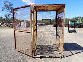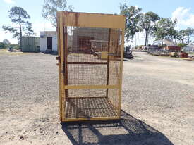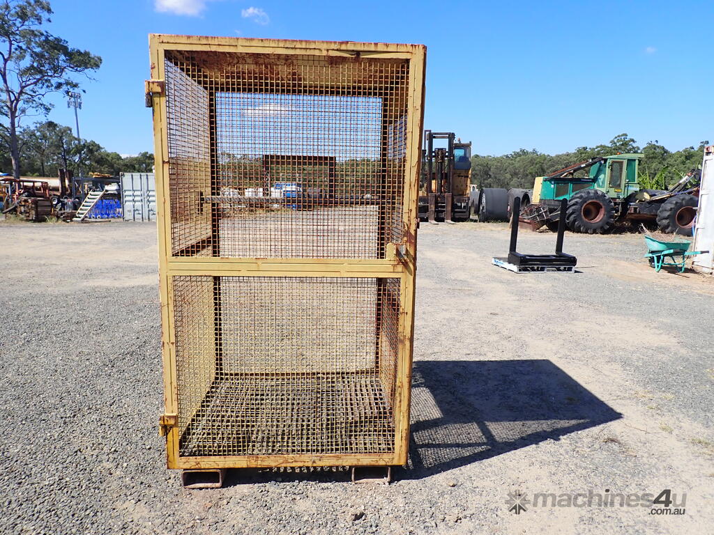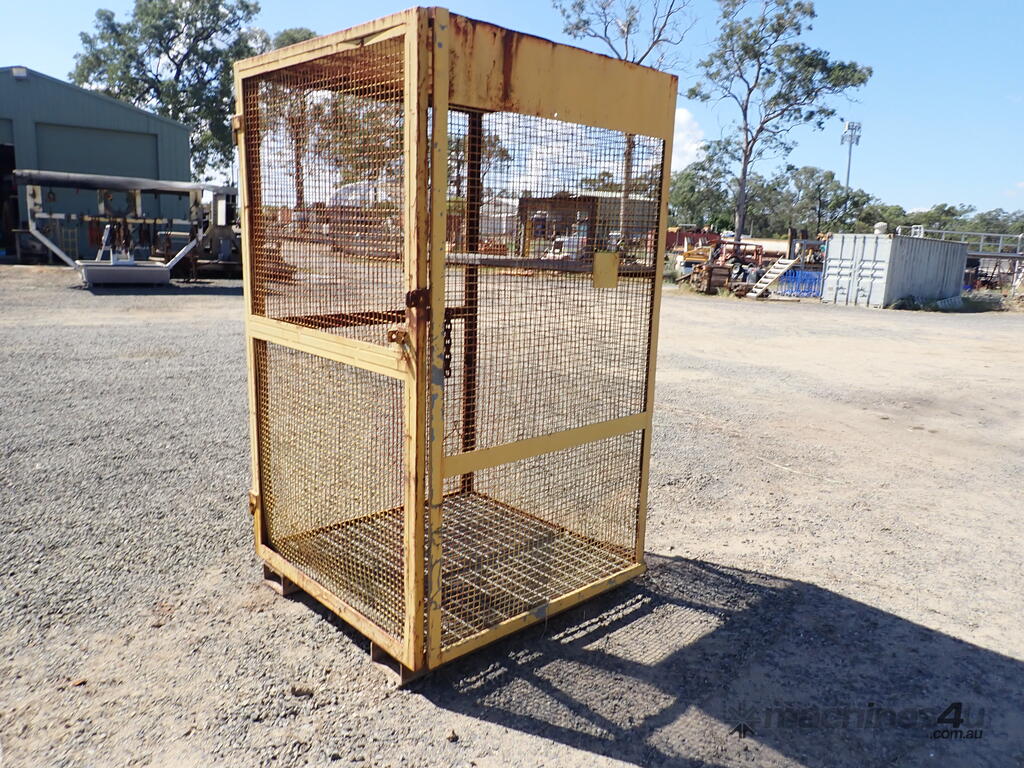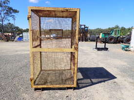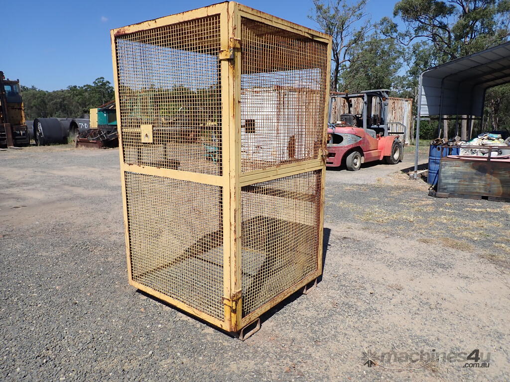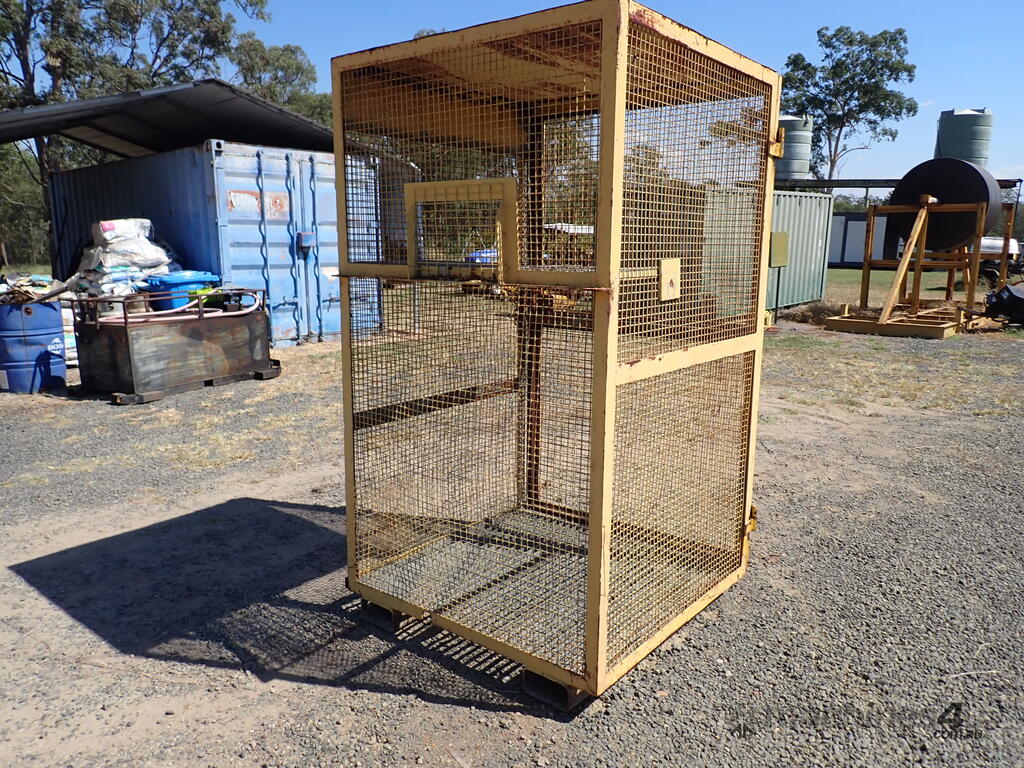 Portable storage cage, all steel construction, forklift pockets underneath, grid mesh floor, 1 x grid mesh shelf, lockable door, flat steel roof, 1.3m x 1.25m x 2.2m high, suitable for site storage of materials or gas bottles or similar, in fair condition, many uses.