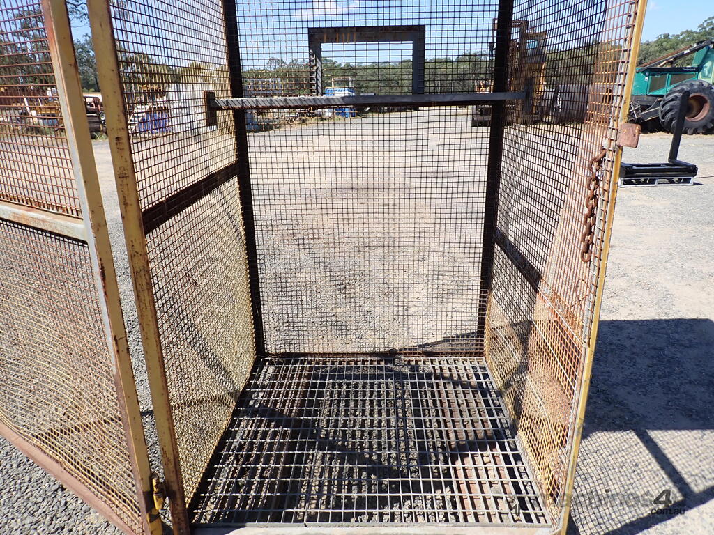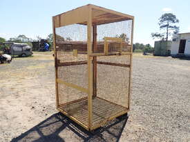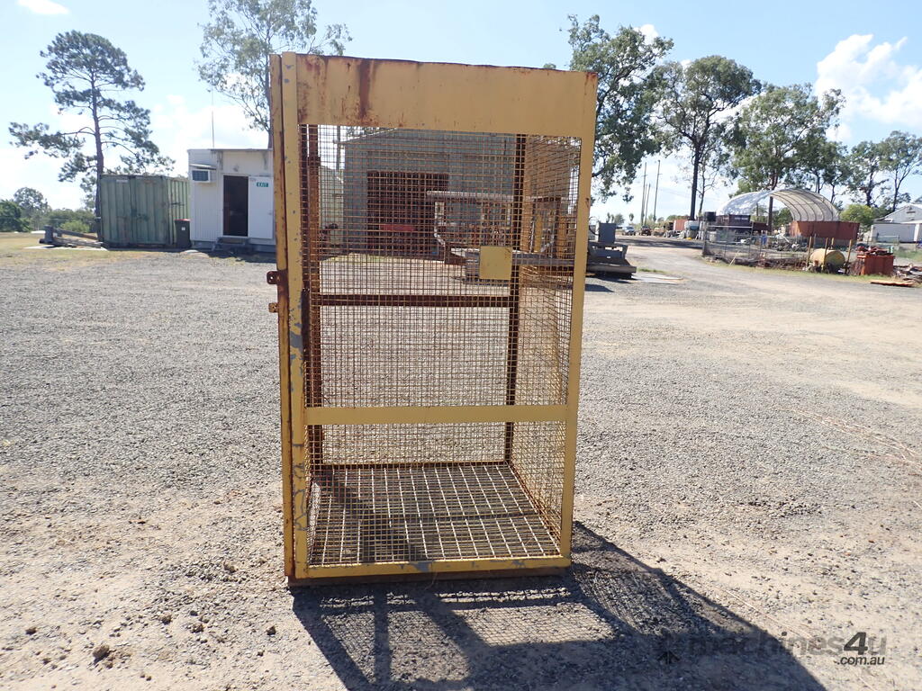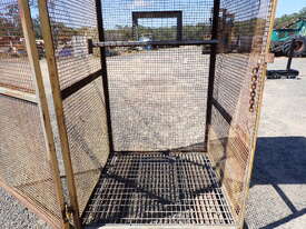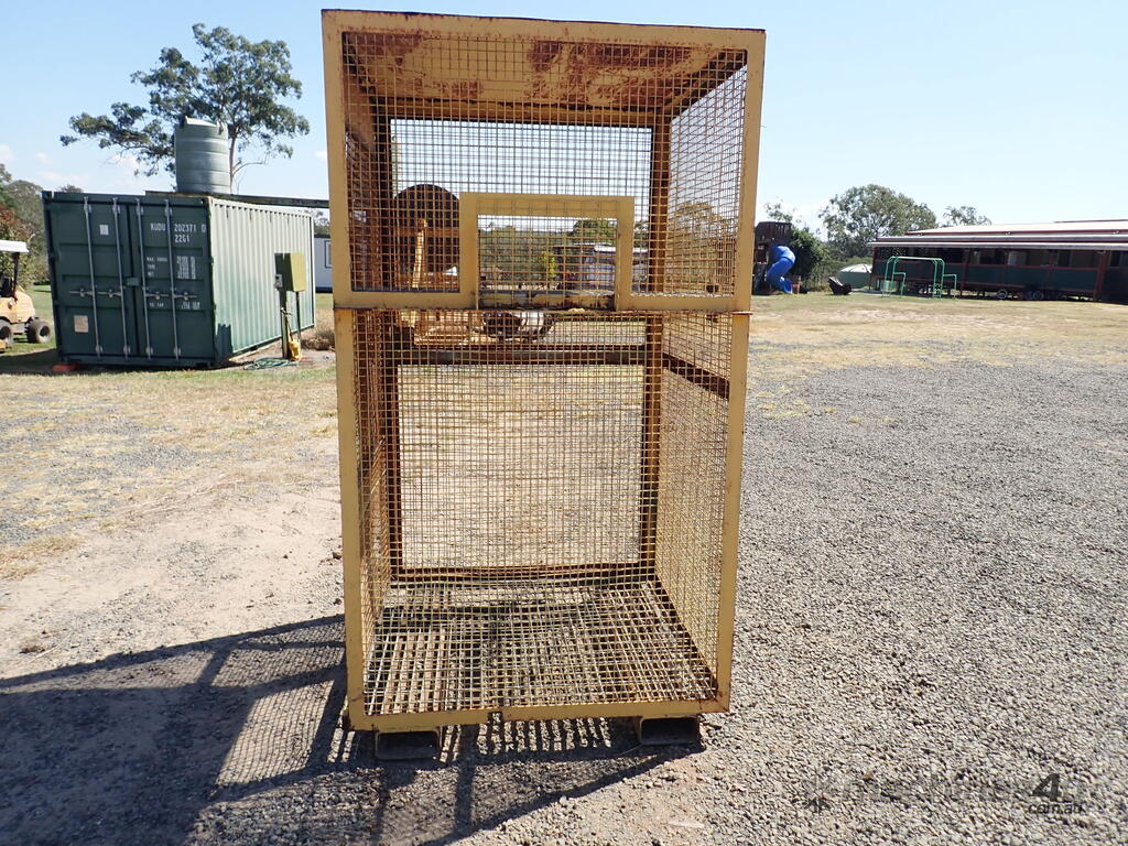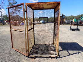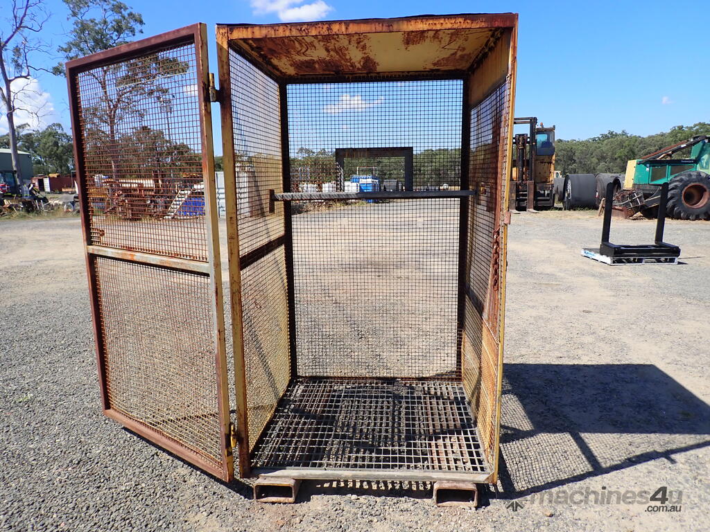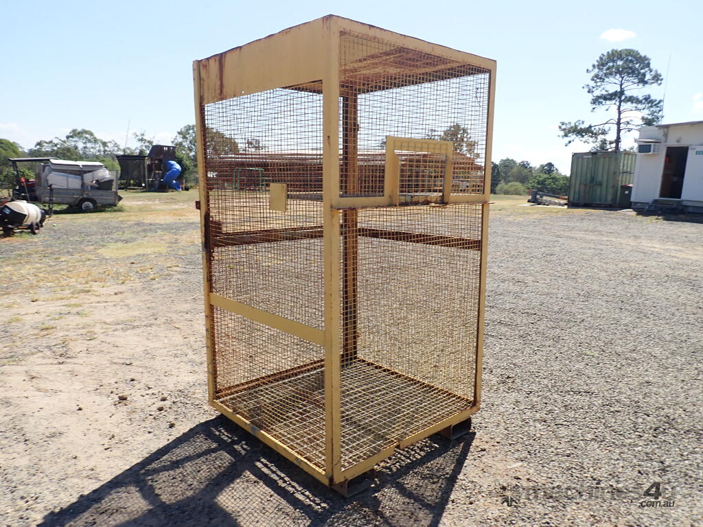 Portable storage cage, all steel construction, forklift pockets underneath, grid mesh floor, 1 x grid mesh shelf, lockable door, flat steel roof, 1.3m x 1.25m x 2.2m high, suitable for site storage of materials or gas bottles or similar, in fair condition, many uses.