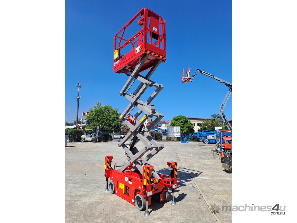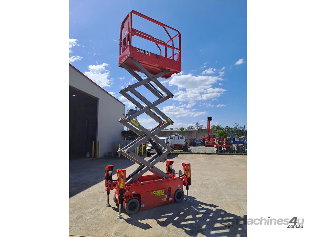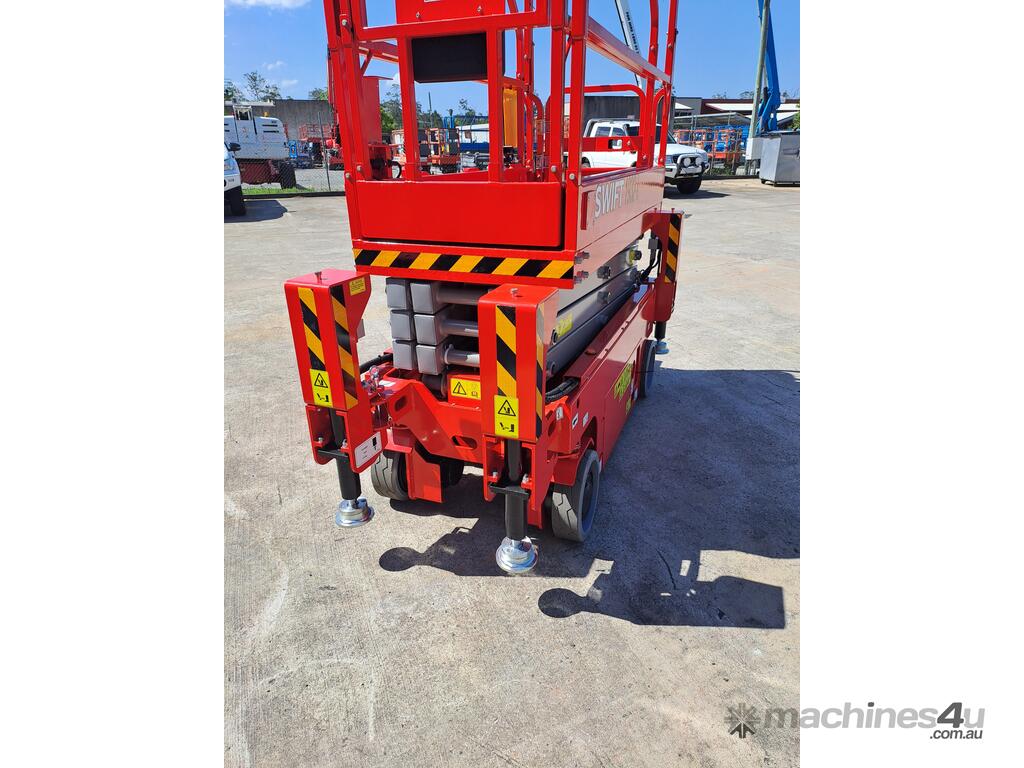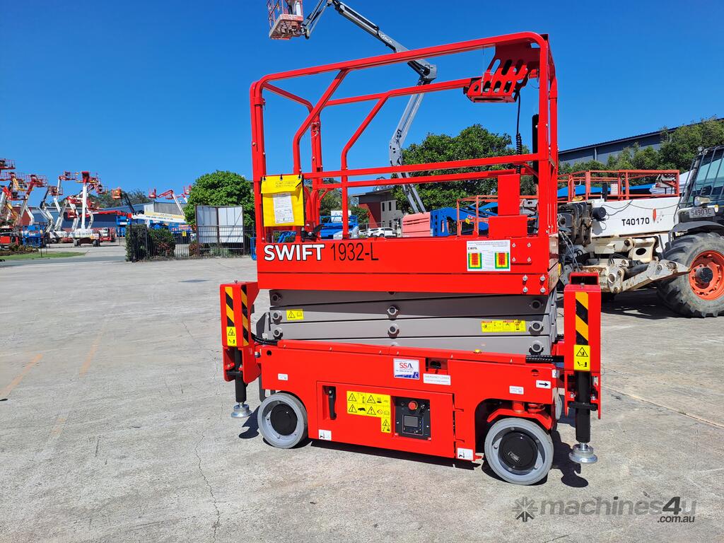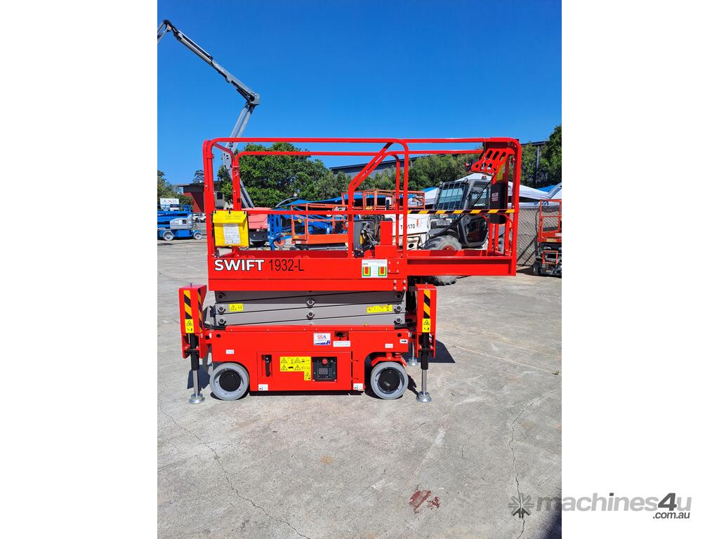 The very sort after and asked about 19ft. Electric Scissor lift with self leveling outriggers is now available , this machine has the ability to level 20 degrees side to side and 10 degrees front to back . The Swift 1932 L also features maintenance free Fullriver sealed batteries . LCD screen at the ground controls and Electric Drive . The outriggers can be swung inwards for getting through tight spaces . This machine also has the feature of once the outriggers are off the ground drive can be selected to save time while the outriggers fully retract . Also included but not pictured are protective non slip rubber feet for the outriggers to protect floors and to grip if required when on tilted surfaces .