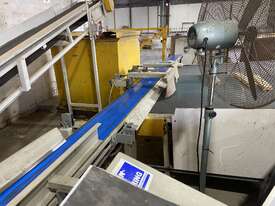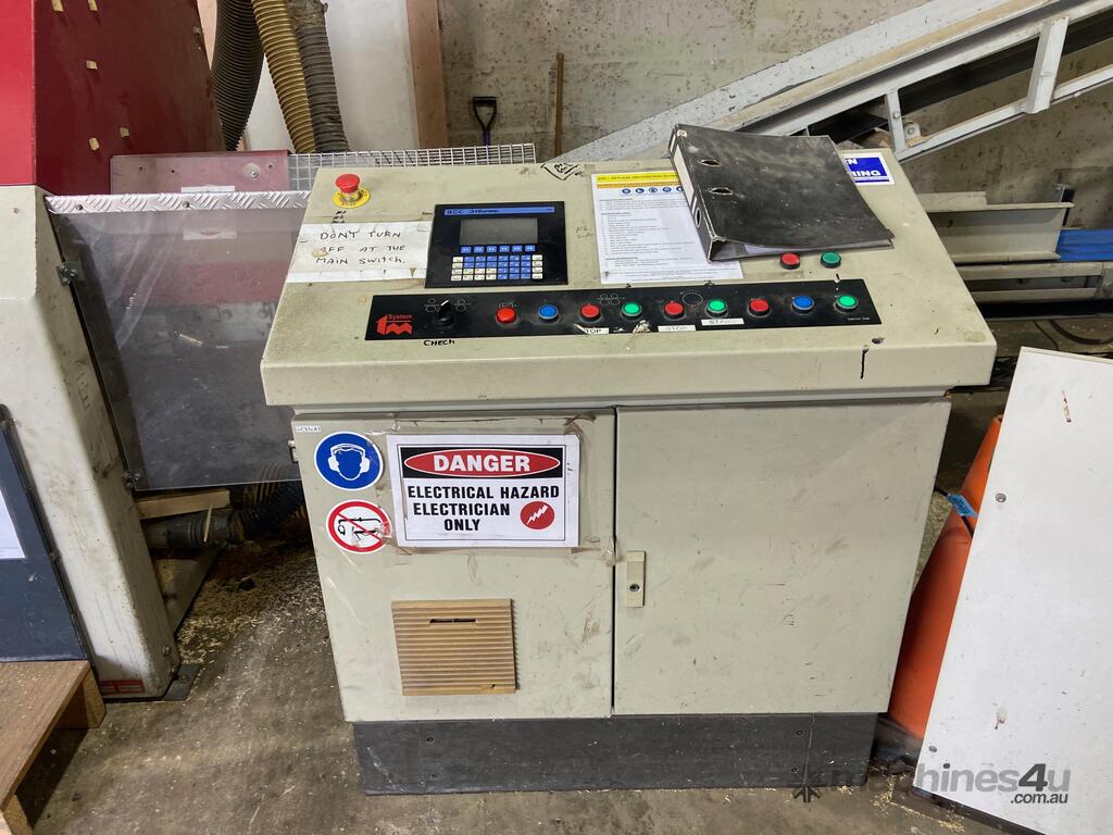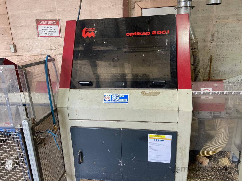 System TM semi optimised docking saw with a 5 strand infeed, 3m long, single piece feed, will optimise to length, feed speed 168m/min, with outfeed conveyor with pneumatic sweepers, still in operation, can be seen running, ideal for set length cutting, price negotiable.