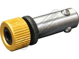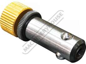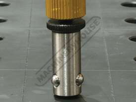 Insert the Ball Lock Bolt over the fixturing element to be mounted on the tabletop. Turn the knurled head with your hands, for initial positioning. The Ball Lock Bolt system consists of three locking steel balls in the bolt shank that move outward to lock against the bottom chamfer of the table plate, pulling the fixture components securely downward and tightening them in place.
