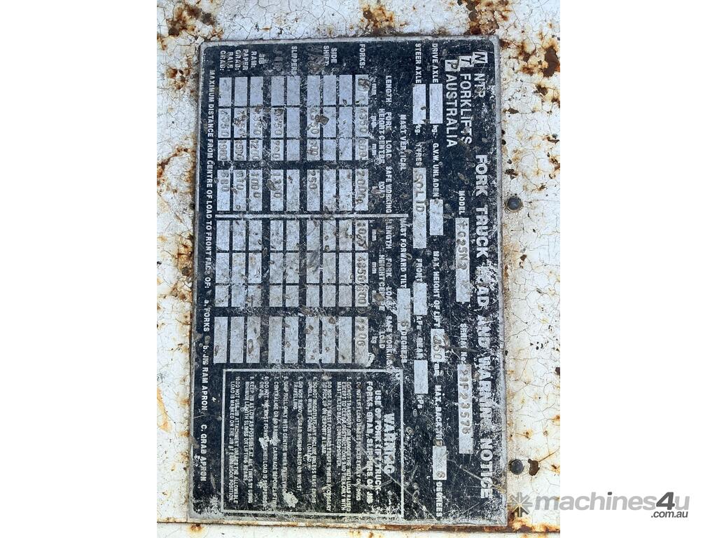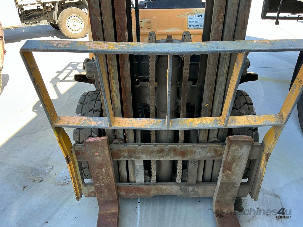 No C/P,TCM,FG25N2,Forklift,Petrol/Gas,Odometer not visible,5763 (Hrs. Showing on Hour meter),Colour: Yellow,Unregistered,Serial No: 21F23576,Sold with No Plates,WOVR Status: WOVR N/A