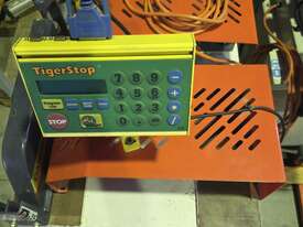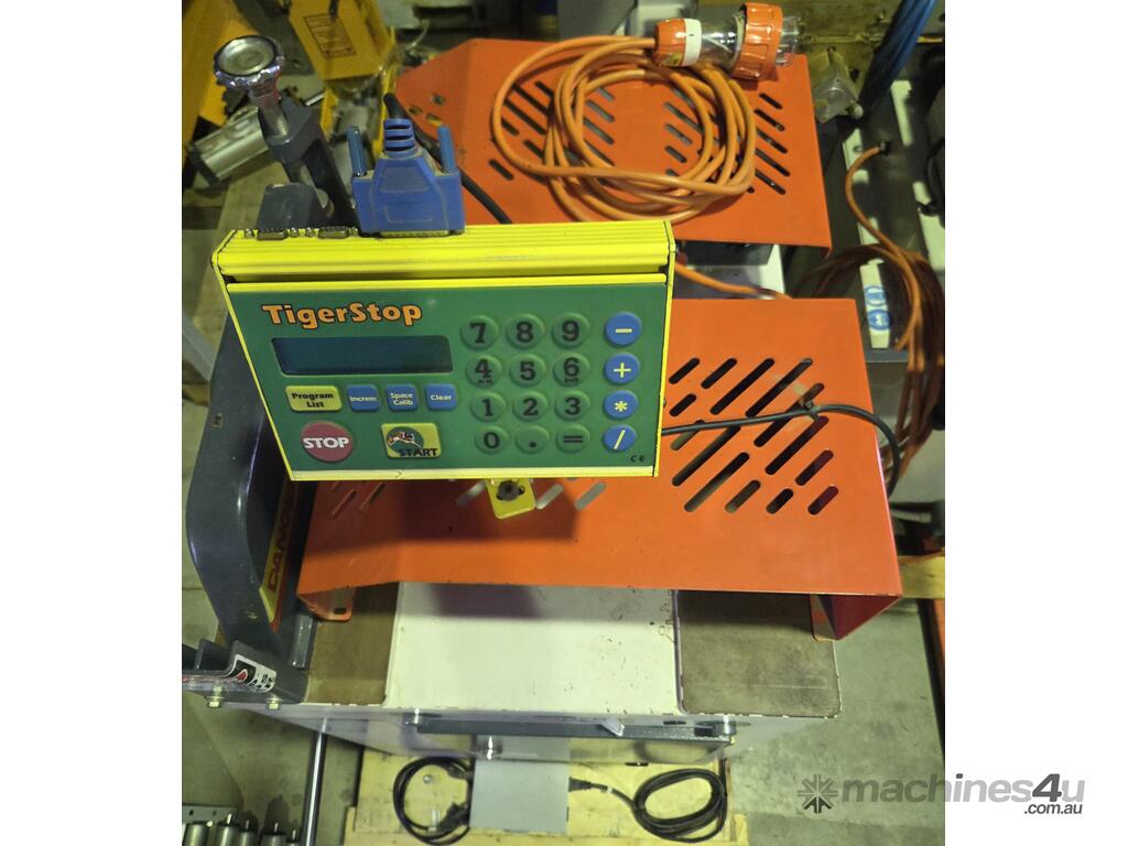 1). TIGER STOP AUTOMATED PUSHER, COMPLETE SYSTEM INCLUDING 4m INFEED PUSHER ROLLER TABLE PLUS OUTFEED ROLLER TABLE, PROGRAMMABLE, MADE IN USA, HEAVY DUTY, LATE MODEL, AS NEW CONDITION. BELOW 1/2 NEW PRICE!