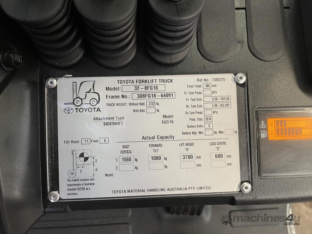 TOYOTA 2018 MODEL 8FG18 DELUXE MODEL S/N 64091 LPG 3.7 METER 2 STAGE MAST 1.8 TON 1800 KG CAPACITY