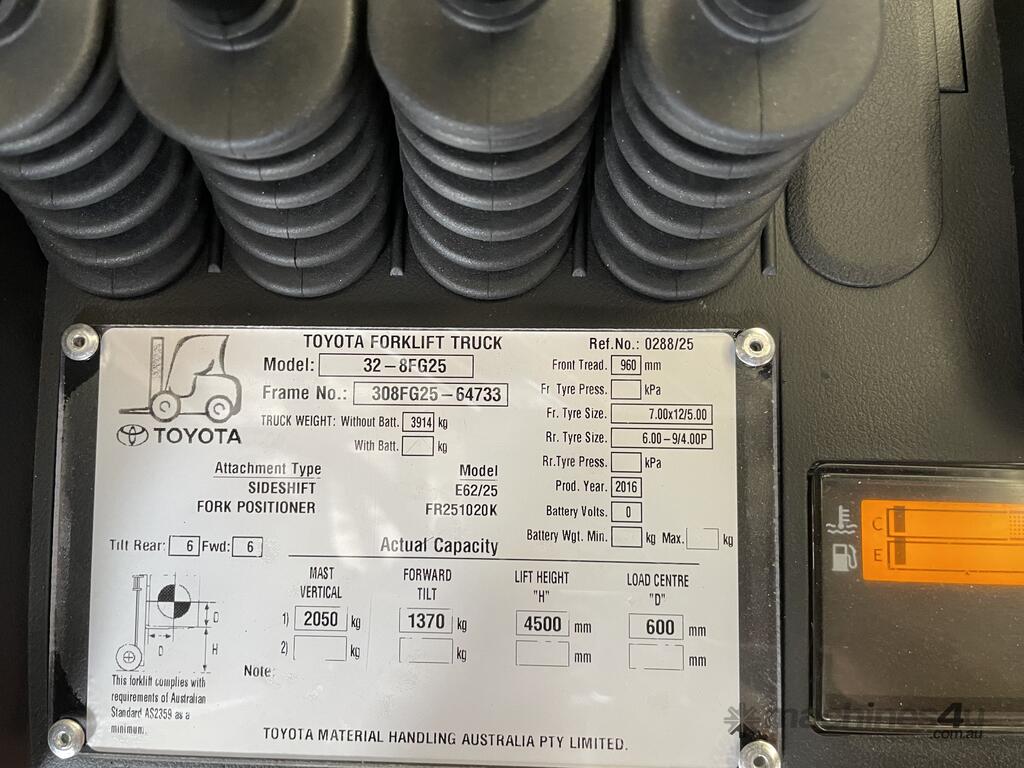 TOYOTA 8FG25 # 64733 DELUXE MODEL 2.5 TON 2500 KG CAPACITY LPG/GAS FORKLIFT 4.5 M 2 STAGE MAST
