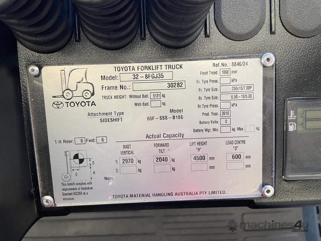 TOYOTA 8FGJ MODEL 3.5 TON 3500 KG CAPACITY LPG GAS FORKLIFT 4500 MM 2 STAGE
