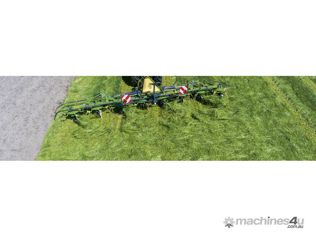 LED light for maximum road safetyCompact V-shaped frame with three-point headstock minimises weight shift from the front axleProp stand at the rear and wide storage stand at the front pro-vide good stability and raise the wheels from the groundStylish light-weight plastic deck in a sloping design for effective self-cleaningHeadland position pre-setting feature avoids tedding the same area twice for optimum wiltingAuto-folding hoop guards maintain maximum agility also in working PositionMain gearbox with overrunning clutch prevents instant rotor stoppingMechanical or hydraulic damper struts ensure stable rides and optimum spreadsNew KRONE OptiTurn tines lift and spread the crop in an ideaal wayGauge wheels run close to the tines providing exact tine control and optimum forage quality