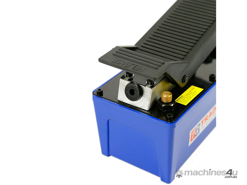 This "TradeQuip Made for the Trade" hand or foot hydraulic air pump is designed to operate pneumatically. It is an ideal power source for various body, frame and alignment applications and can be used with different ram kits, shop presses and hydraulic pullers (not included) that operate with a hydraulic oil pressure requirement of up to 10,000 psi.
