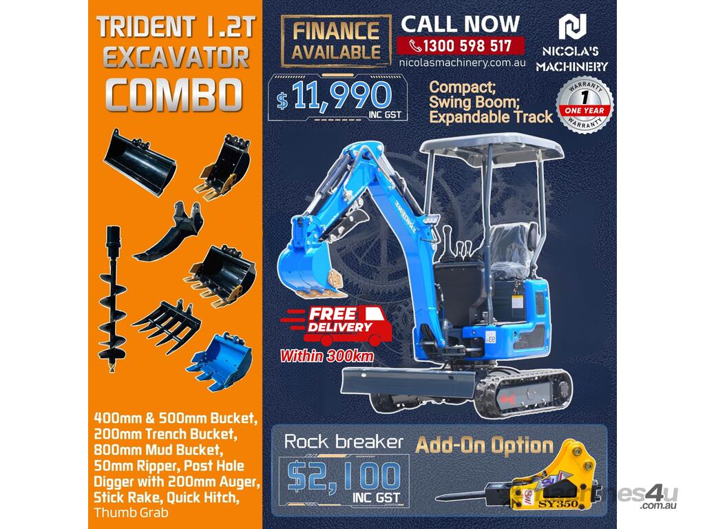 Save $4,000 on the Trident 1.2T Excavator, with free delivery within 300km from our warehouse. Includes 1-year warranty. Don't miss this offer!