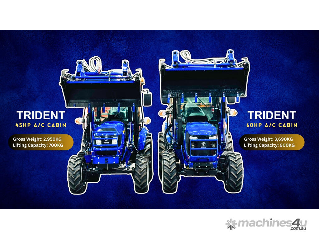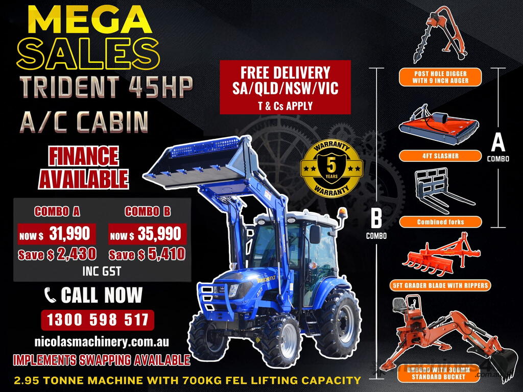 COMBO B: TRIDENT 45HP 4WD A/C cabin tractor with FEL 4in1 bucket + backhoe BH6600 with 300MM standard bucket + 4FT slasher + 5FT grader blade with ripper + post hole digger with 9 inch auger + combined forks (pallet + hay) for only $34,990 inc. GST