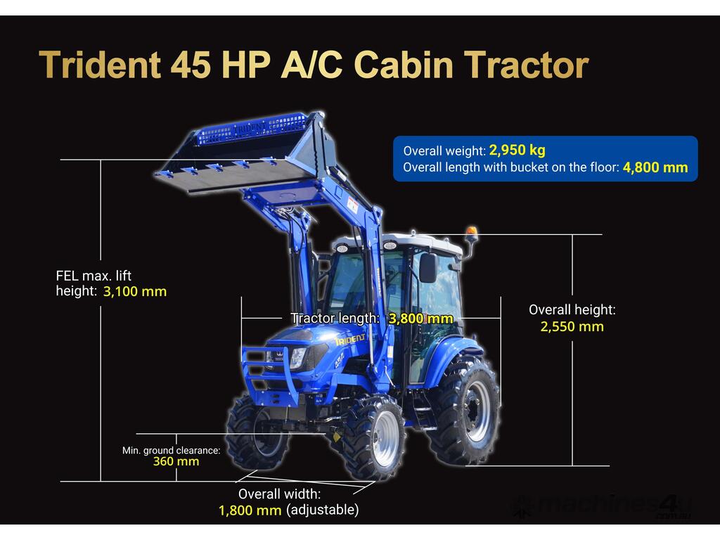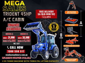 COMBO A: TRIDENT 45HP 4WD A/C cabin tractor with FEL 4in1 bucket + 4FT slasher + post hole digger with 9 inch auger + combined forks (pallet + hay) for only $30,990 inc. GST