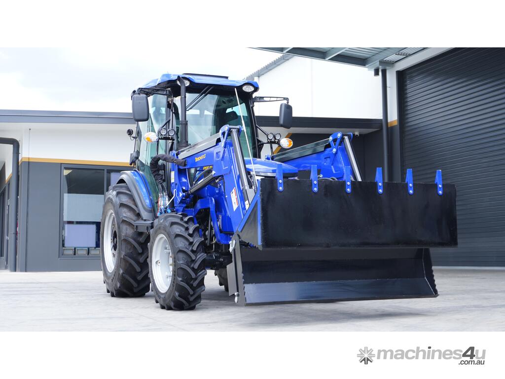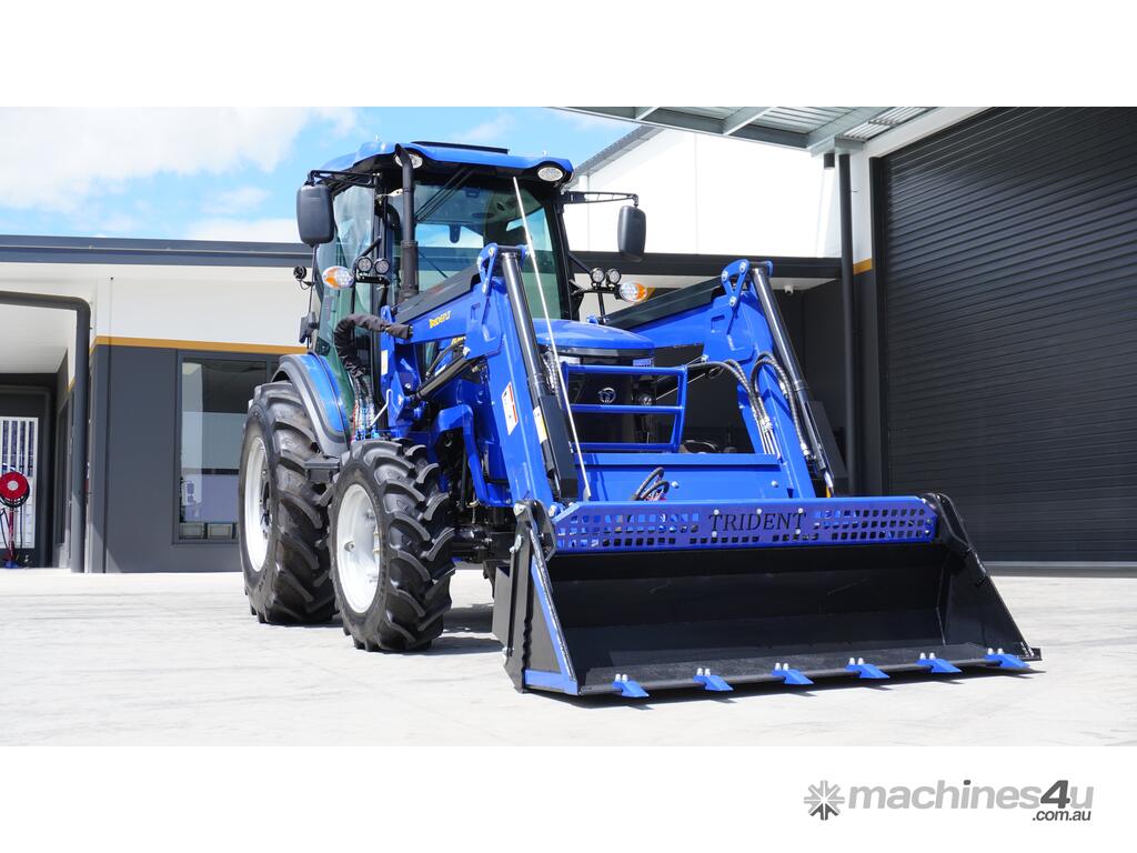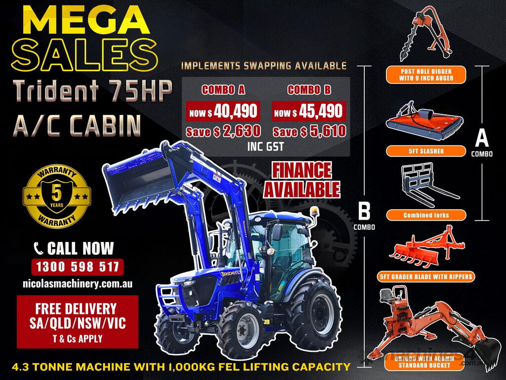 COMBO B: TRIDENT 75 HP 4WD A/C cabin tractor with FEL 4 in 1 bucket + backhoe BH7600 with 400mm standard bucket + 5FT slasher + 5FT grader blade with ripper + post hole digger with 9 inch auger + combined forks (pallet + hay) for only $45,490 inc. GST