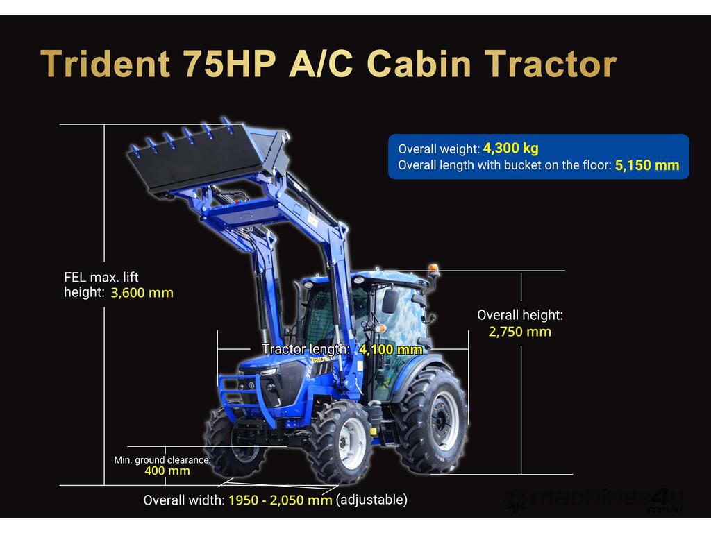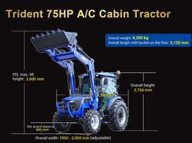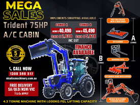 COMBO A: TRIDENT 75 HP 4WD A/C cabin tractor with FEL 4in1 bucket + 5FT slasher + post hole digger with 9 inch auger combined forks (pallet + hay) for only $40,490 inc. GST