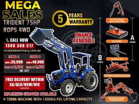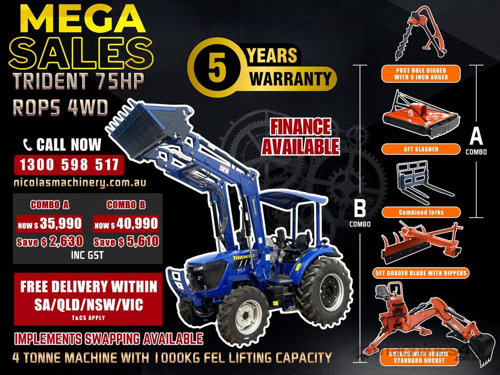 COMBO B: TRIDENT 75HP 4WD canopy tractor with FEL 4in1 bucket + backhoe BH7600 with 400mm standard bucket + 5FT slasher + 5FT grader blade with ripper + post hole digger with 9 inch auger combined forks (pallet + hay) for only $40,990 inc. GST
