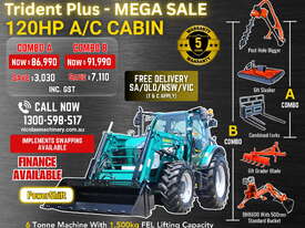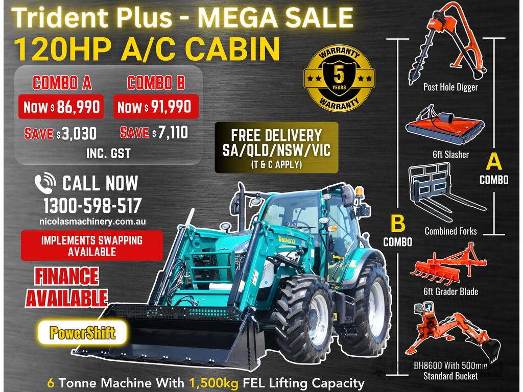 COMBO B: TRIDENT PLUS 120HP Powershift 4WD A/C cabin tractor with FEL 4in1 bucket + backhoe BH8600 with 500mm standard bucket + 6FT slasher + 6FT grader blade with ripper + post hole digger with 9 inch auger + combined forks (pallet + hay) for only $91,990 inc. GST