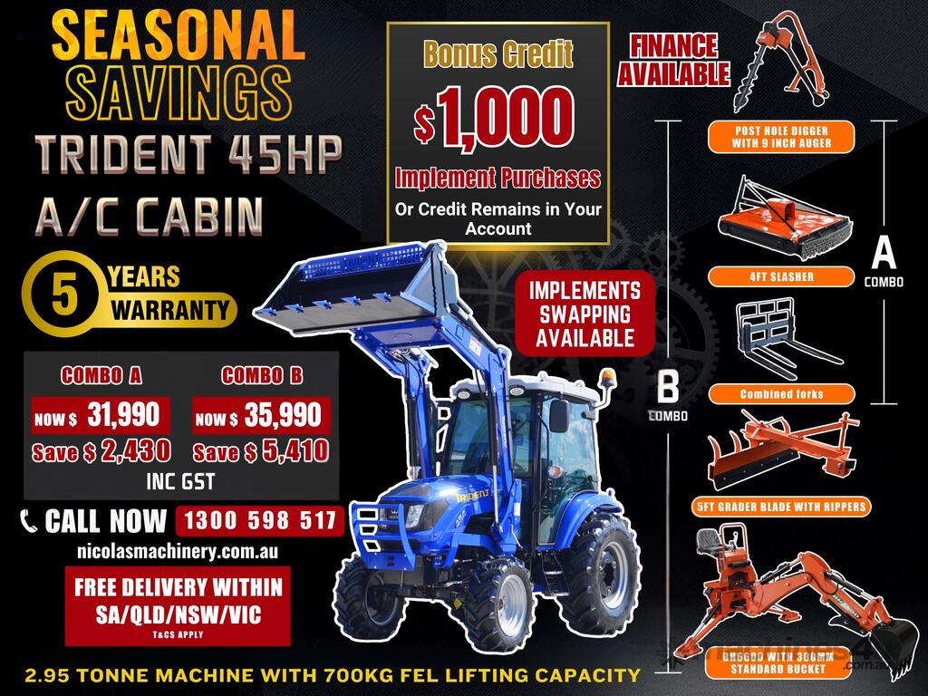 COMBO B: TRIDENT 45HP 4WD A/C cabin tractor with FEL 4in1 bucket + backhoe BH6600 with 300MM standard bucket + 4FT slasher + 5FT grader blade with ripper + post hole digger with 9 inch auger + combined forks (pallet + hay) for only $34,990 inc. GST