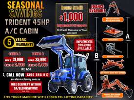 COMBO A: TRIDENT 45HP 4WD A/C cabin tractor with FEL 4in1 bucket + 4FT slasher + post hole digger with 9 inch auger + combined forks (pallet + hay) for only $30,990 inc. GST