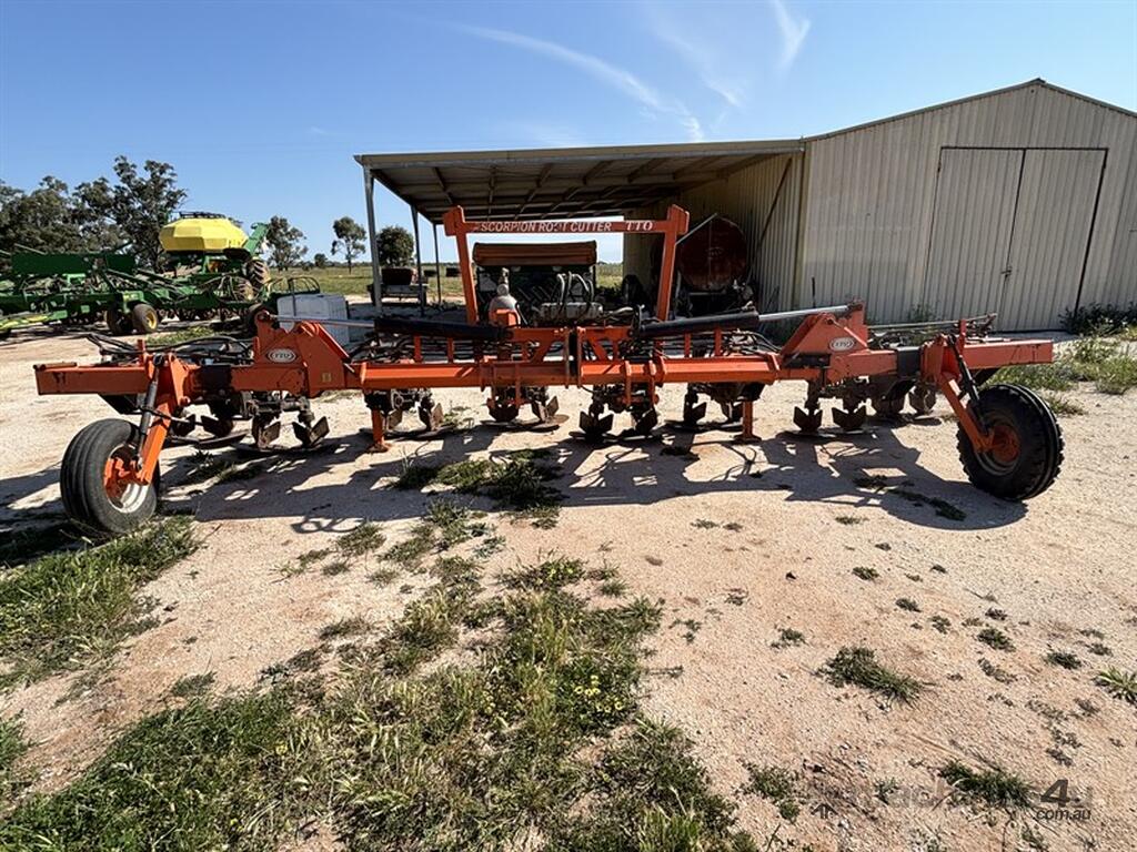 TTQ SCORPION ROOT CUTTER, S/N: T8RC020680, 8 row on hydraulic folding tool bar, good discs, in working order, available through MRE Auctions, contact Jono