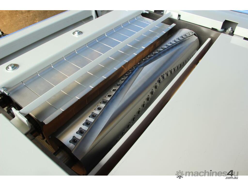 Large 85mm Steel In-Feed Roller to provide greater contact to the workpiece. This roller features a patented Rocker System which allows multiple pieces of slightly different heights to be fed into the machine.