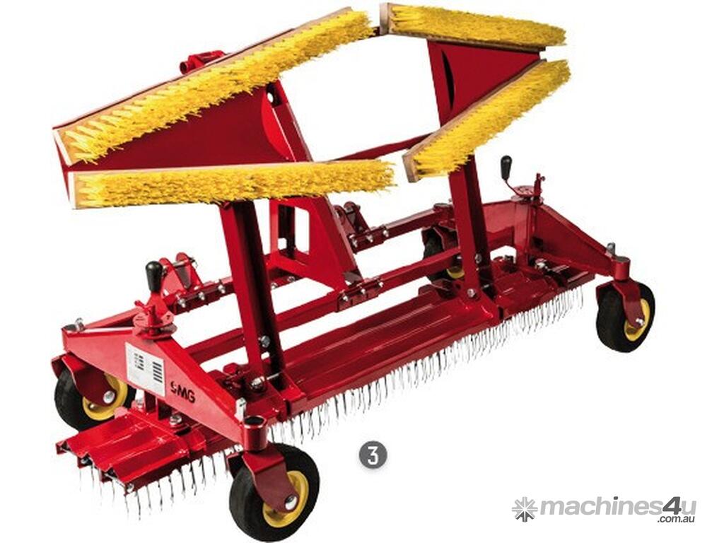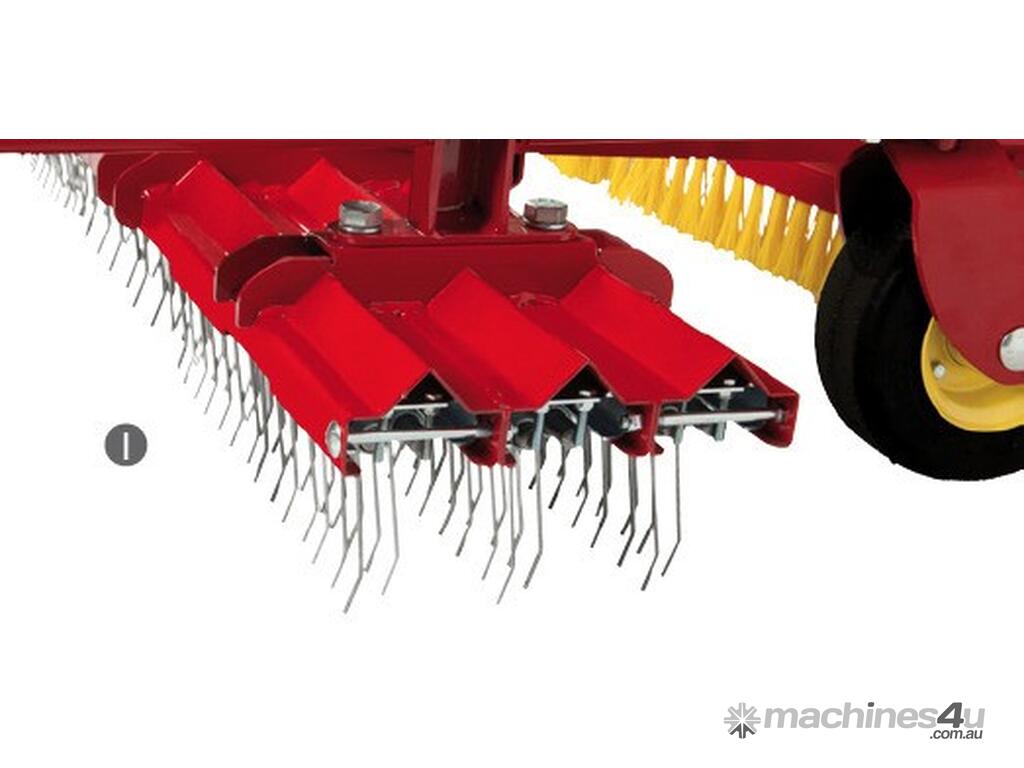 3-point rear-mount type accessory with variable hitches fits all commercially available utility tractors. It is used for loosening of infilled artificial turf and to straighten the fibres. The infill material is equalized with the trailing drag brush.