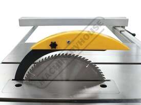 The main table is extremely heavily webbed cast iron which provides a rigid mounting point to connect the trunnion mechanism to support the 305mm main blade. The induction motor power is provided by a 3.75kW / 5hp 415V via three A-section belts that will drive the blade through the most stubbornness timbers. The heavy-duty fence securely locks onto the front and rear of the extra-long square metal tubes to allow a huge 1220mm ripping capacity.