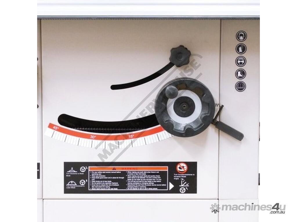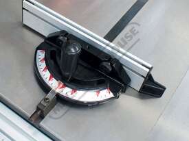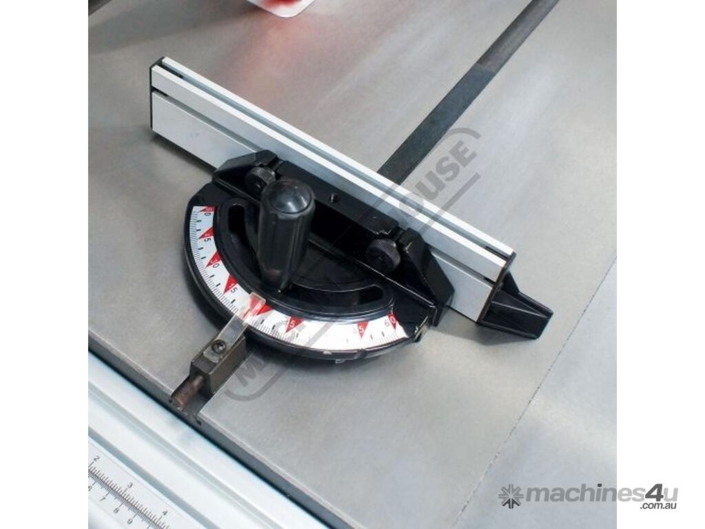 The cast iron table provides great strength and rigidity as well as a smooth user-friendly working surface. The micro adjustable rip fence is full length and cam locked solidly onto rails at the front and back of the table and can be used both sides of the blade. A mitre guide included slides in a T-slot grooves in the table on either side of the blade. Both the blade height and tilt controls have large handles that are conveniently located on front & side of the table saw.