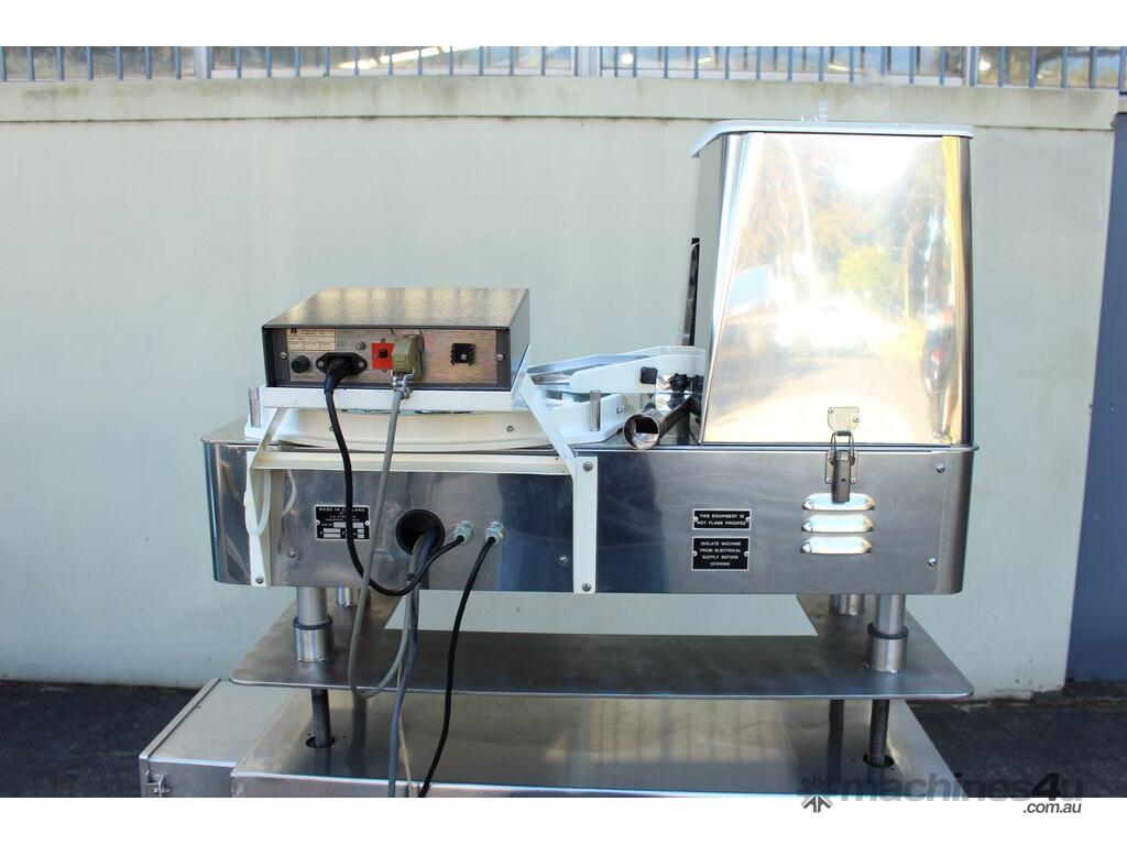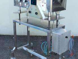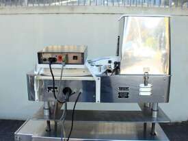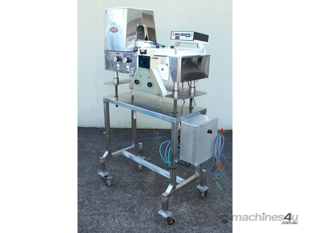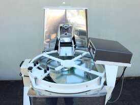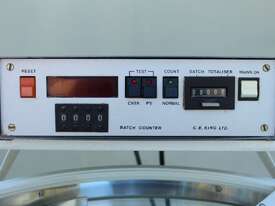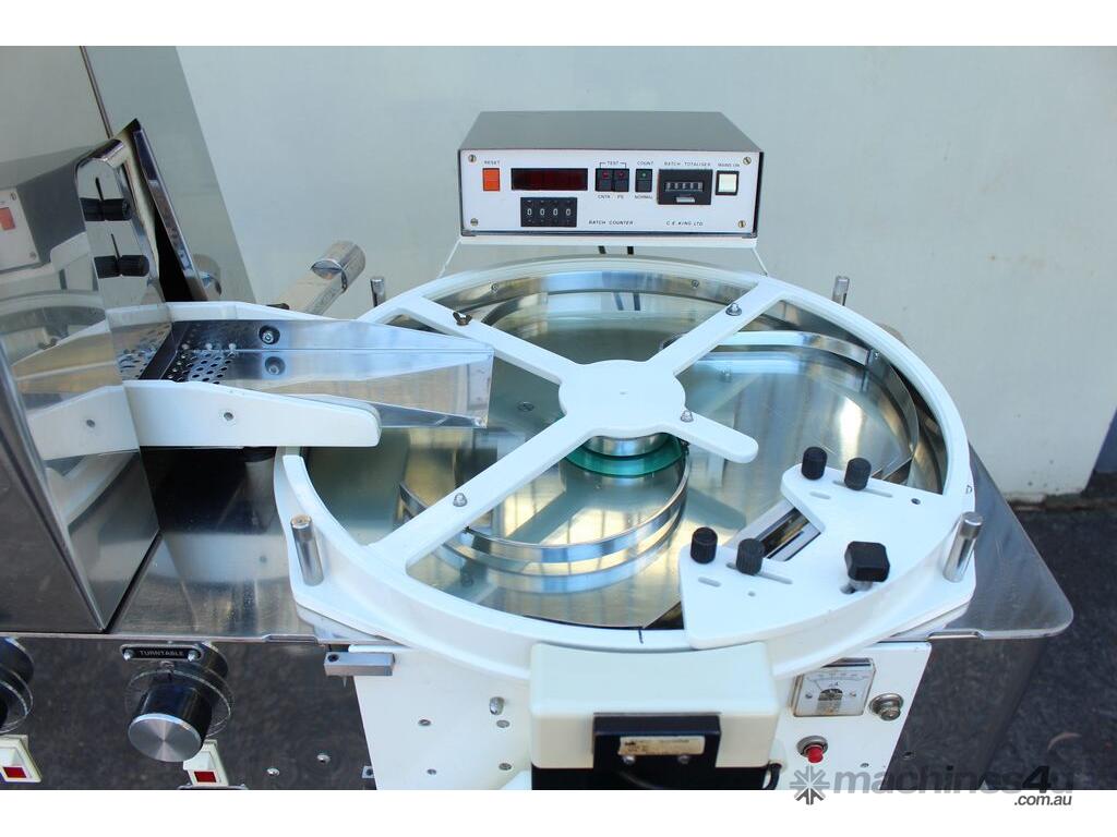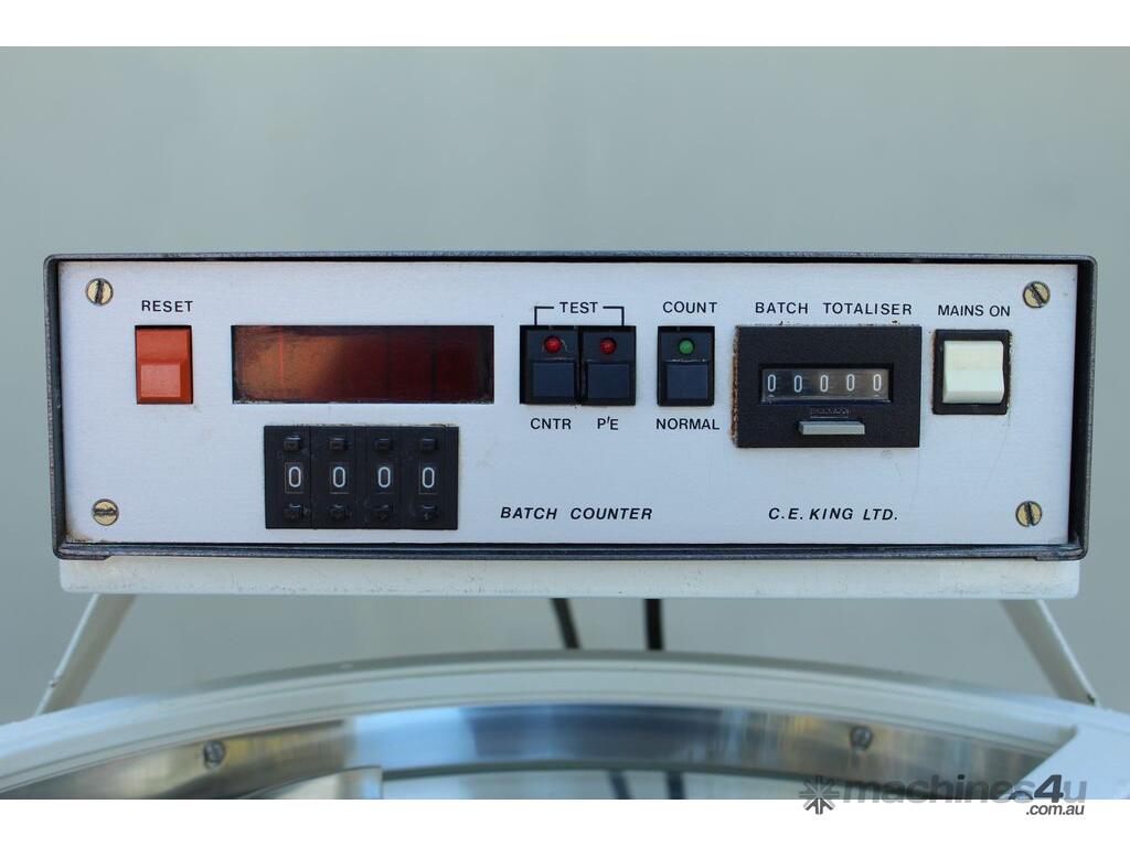 Tablet Counter, "King" Model TB4 GMP, feeding hopper and vibrating guide rail, counting station with photocell, electronic counter with display, stainless steel turntable, structure in polished stainless steel, single phase, mounted over a stainless steel trolly