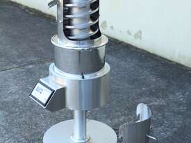 Tablet Deduster, "Kramer" type KD6010, compact stainless steel construction on mobile frame, designed for gentle dedusting and deburring of tablets after compression, suitable for pharmaceutical production environments, robust easy-clean design with quiet operation, complete with adjustable settings for throughput, 240V single phase power supply